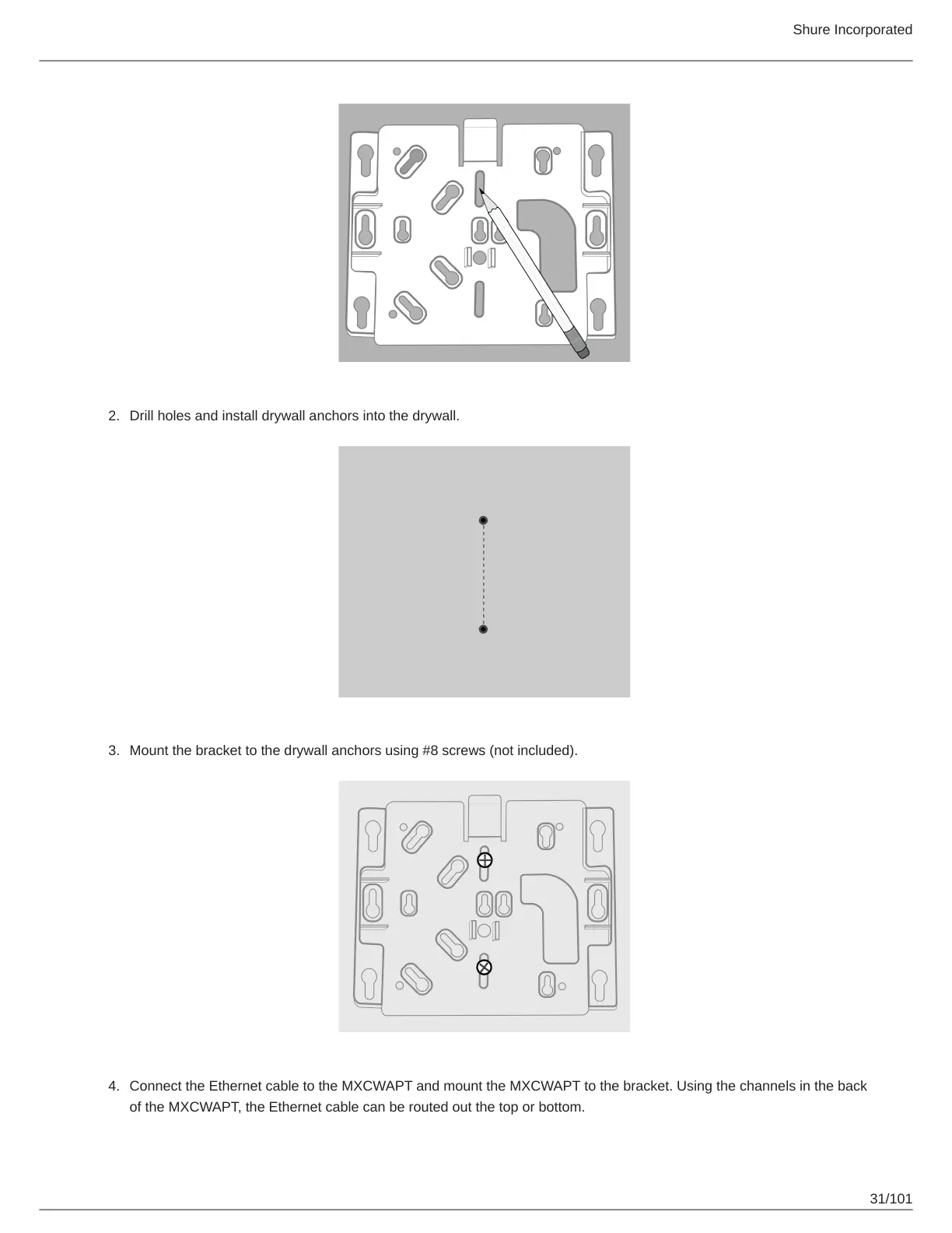 Mount the bracket to the drywall anchors using #8 screws (not included).