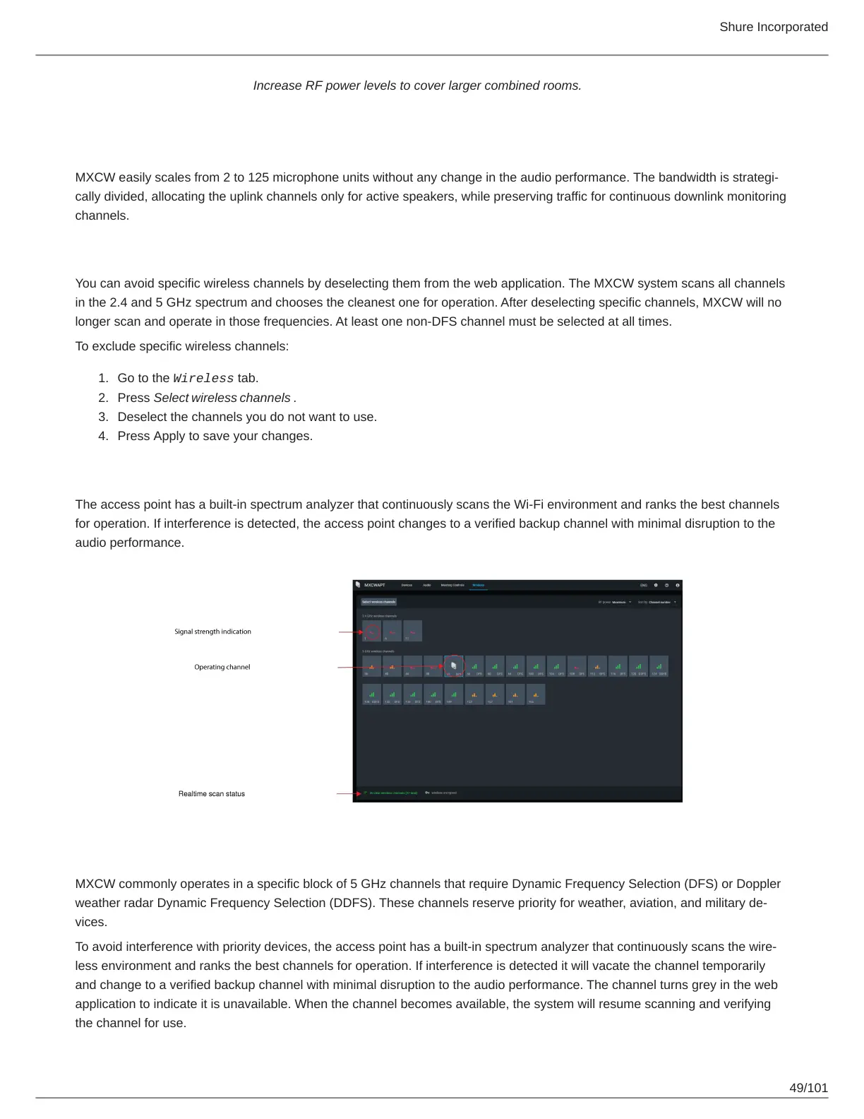 You can avoid specific wireless channels by deselecting them from the web application. The MXCW system scans all channels