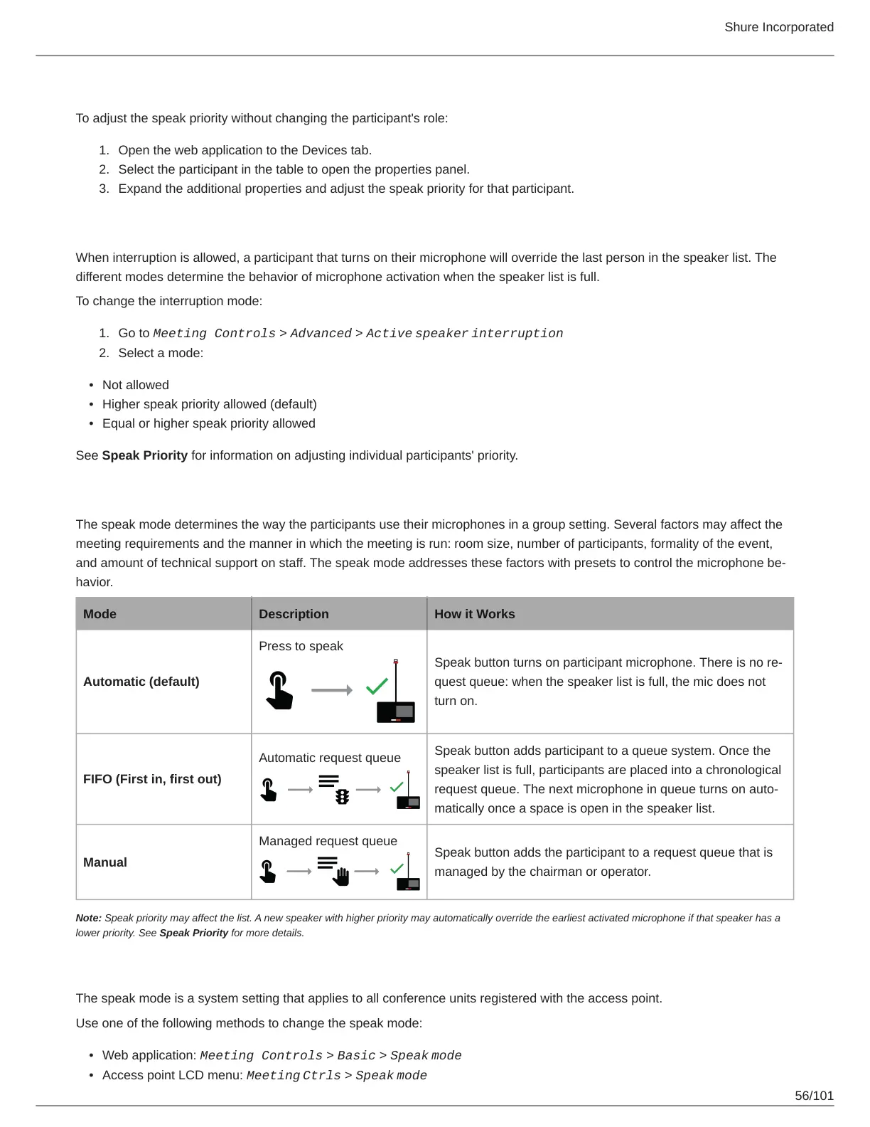 Note: Speak priority may affect the list. A new speaker with higher priority may automatically override the earliest activated microphone if that speaker has a