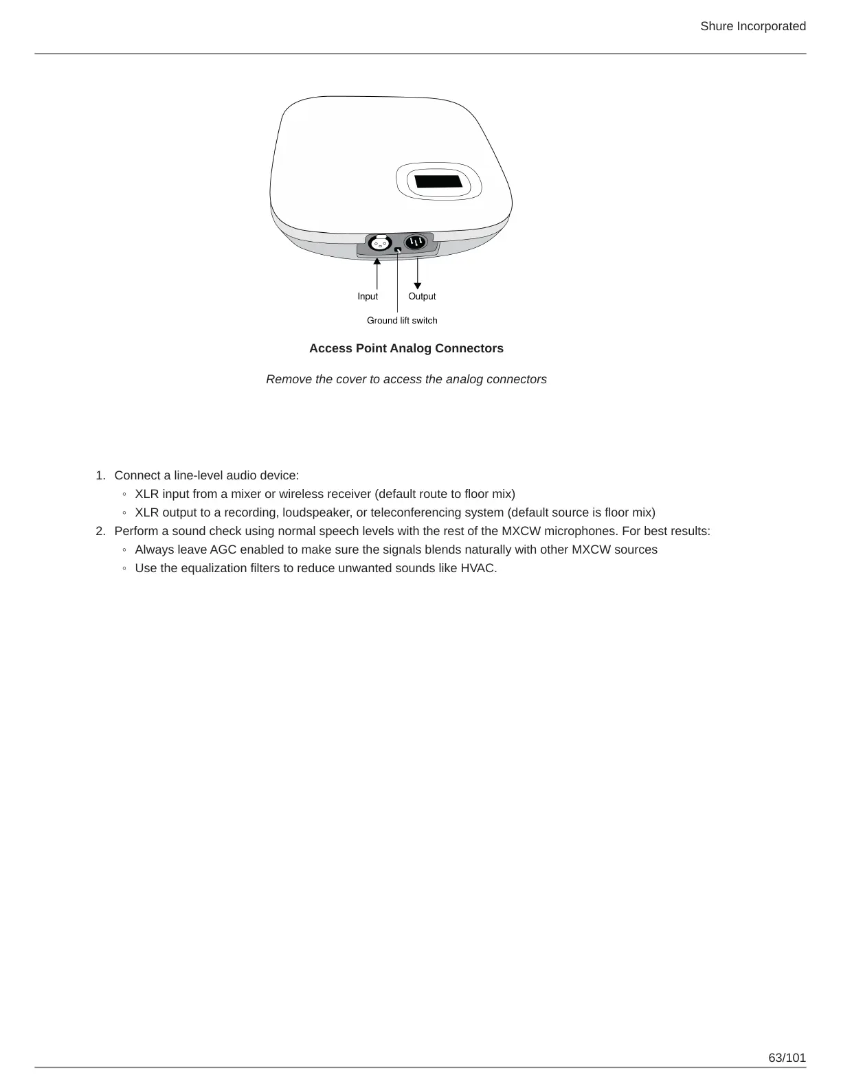 Perform a sound check using normal speech levels with the rest of the MXCW microphones. For best results: