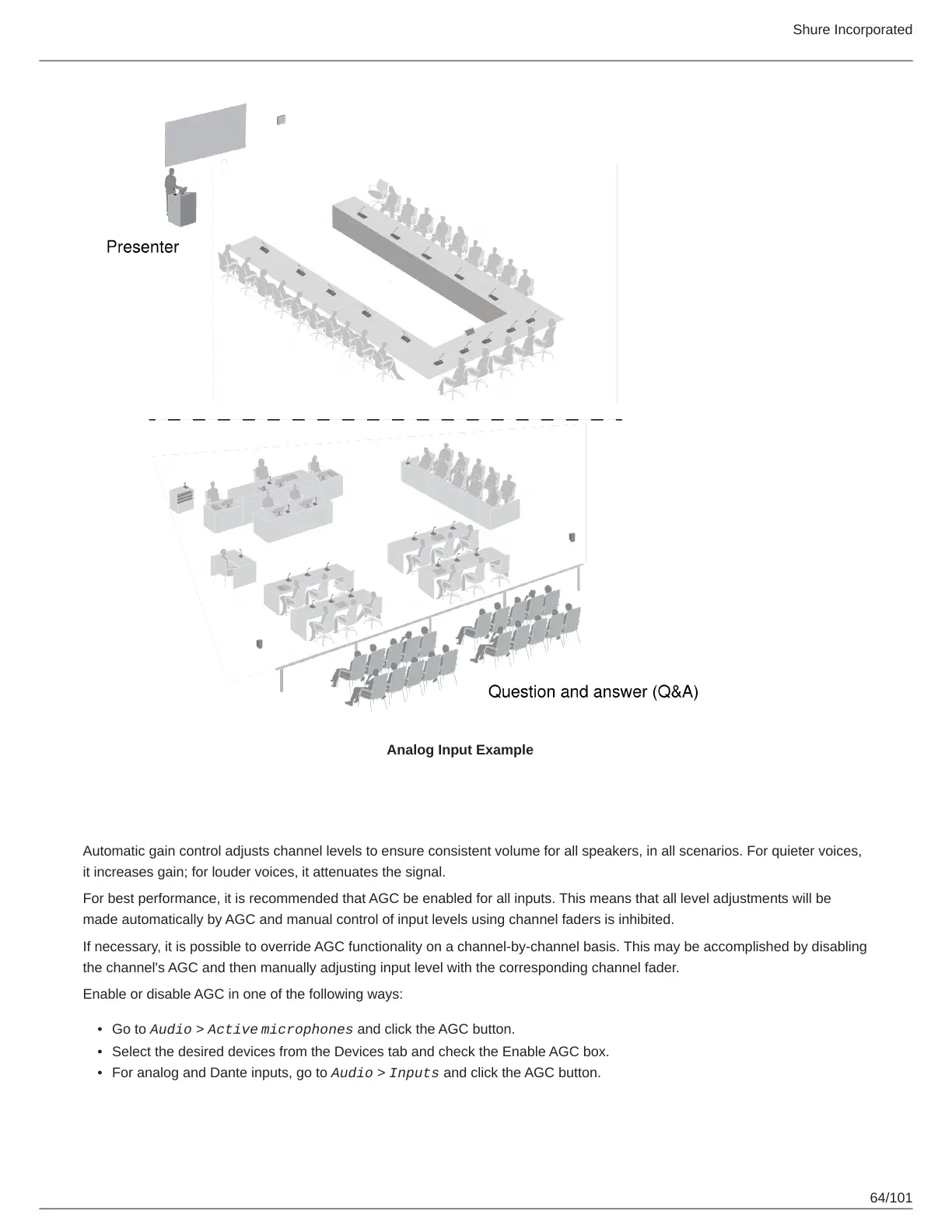 For analog and Dante inputs, go to Audio > Inputs and click the AGC button.