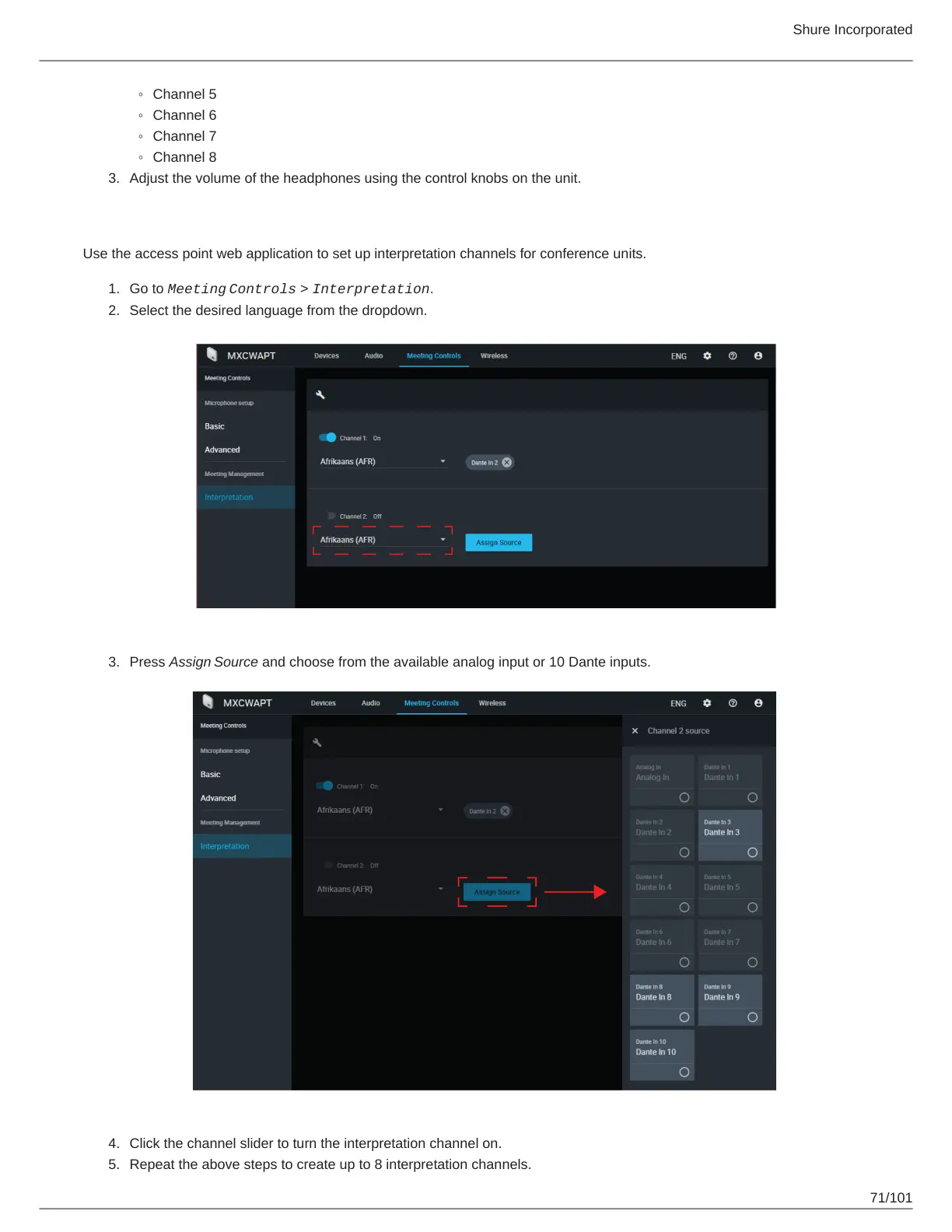 Press Assign Source and choose from the available analog input or 10 Dante inputs.