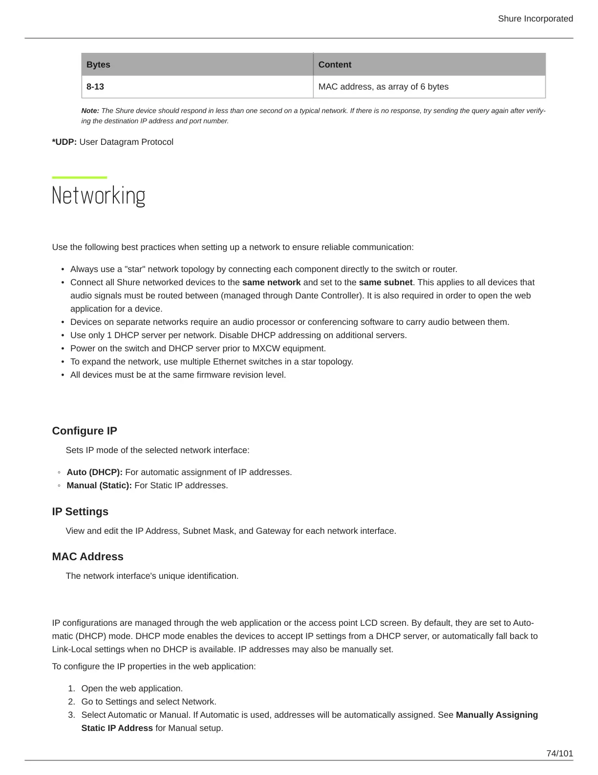 Note: The Shure device should respond in less than one second on a typical network. If there is no response, try sending the query again after verify-