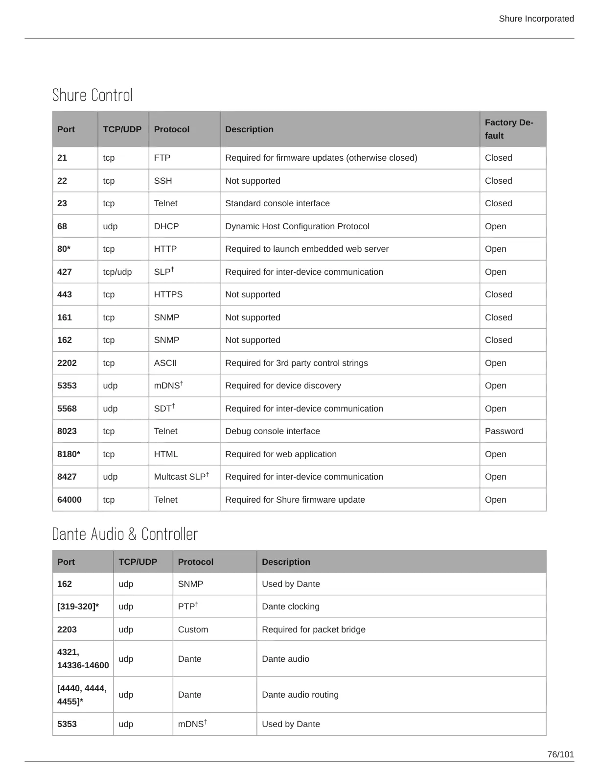 64000 tcp Telnet Required for Shure firmware update Open