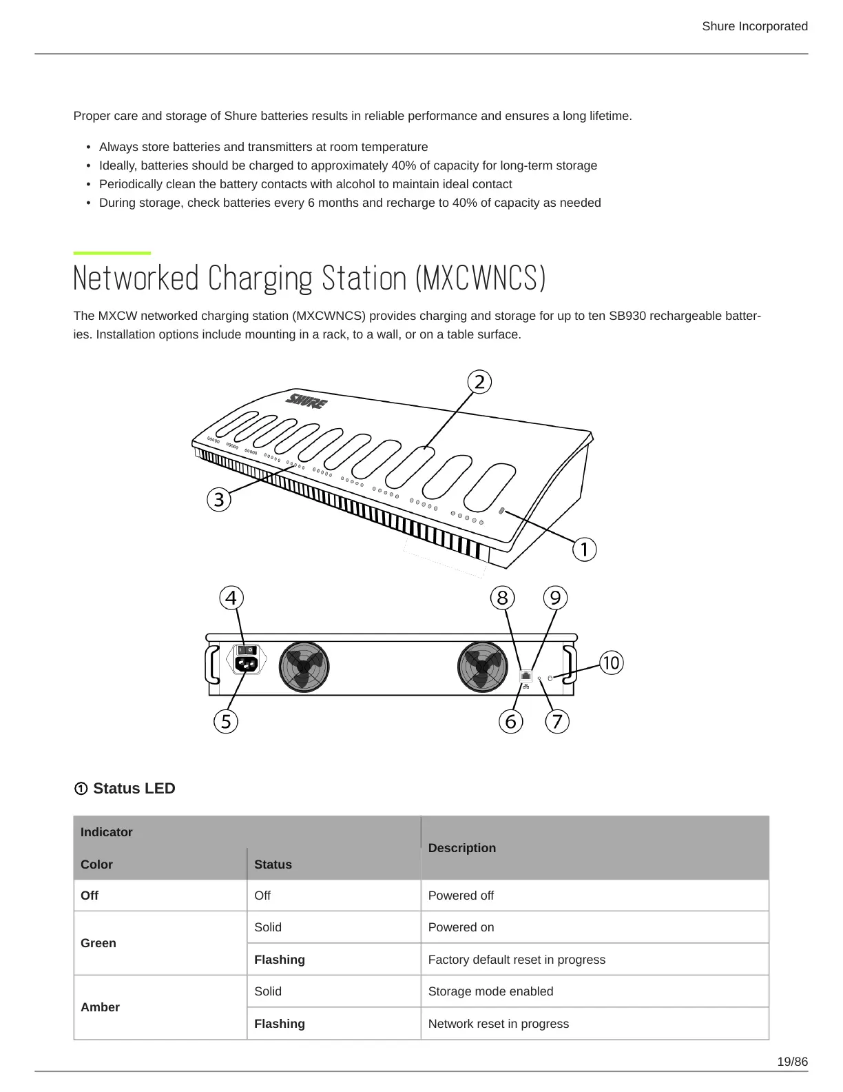 The MXCW networked charging station (MXCWNCS) provides charging and storage for up to ten SB930 rechargeable batter