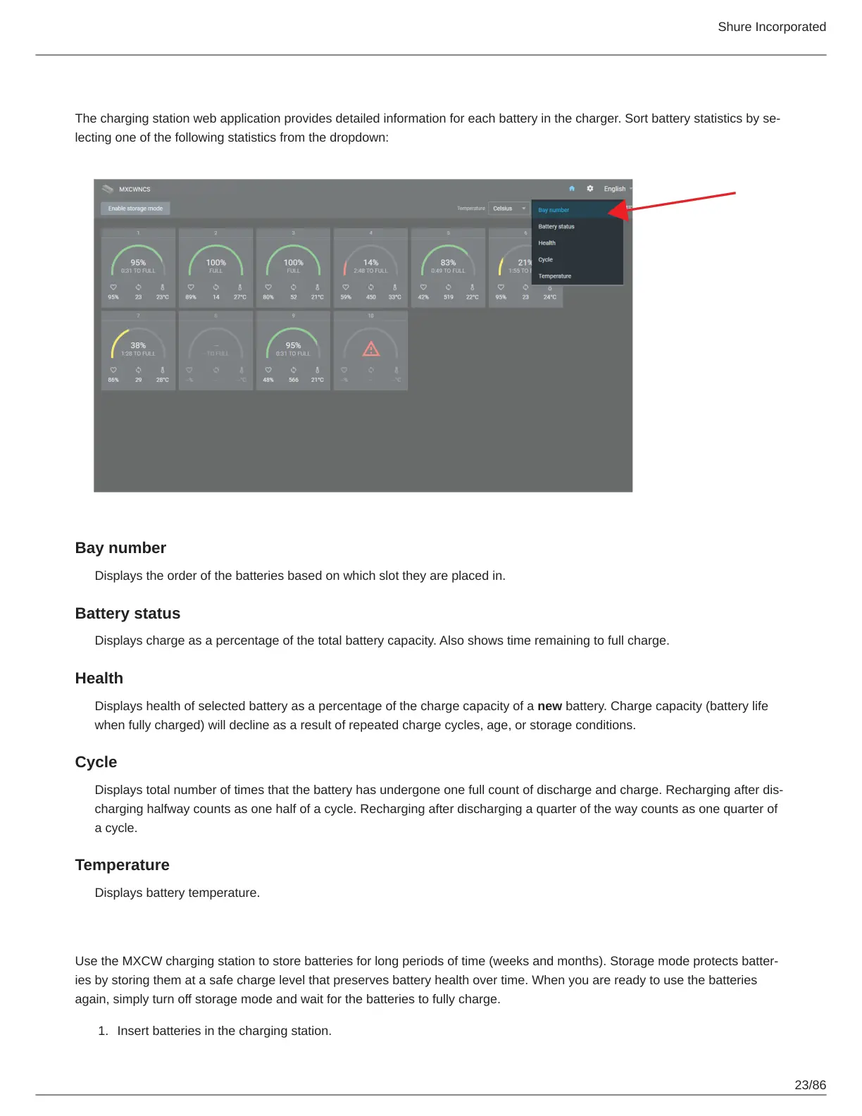 Use the MXCW charging station to store batteries for long periods of time (weeks and months). Storage mode protects batter