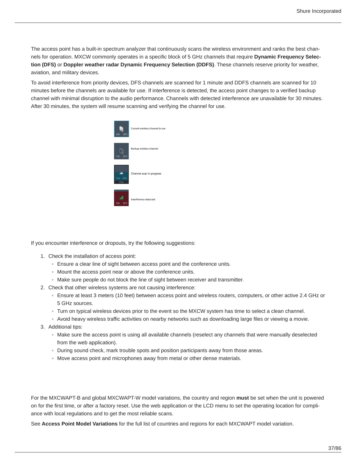 channel with minimal disruption to the audio performance. Channels with detected interference are unavailable for 30 minutes.