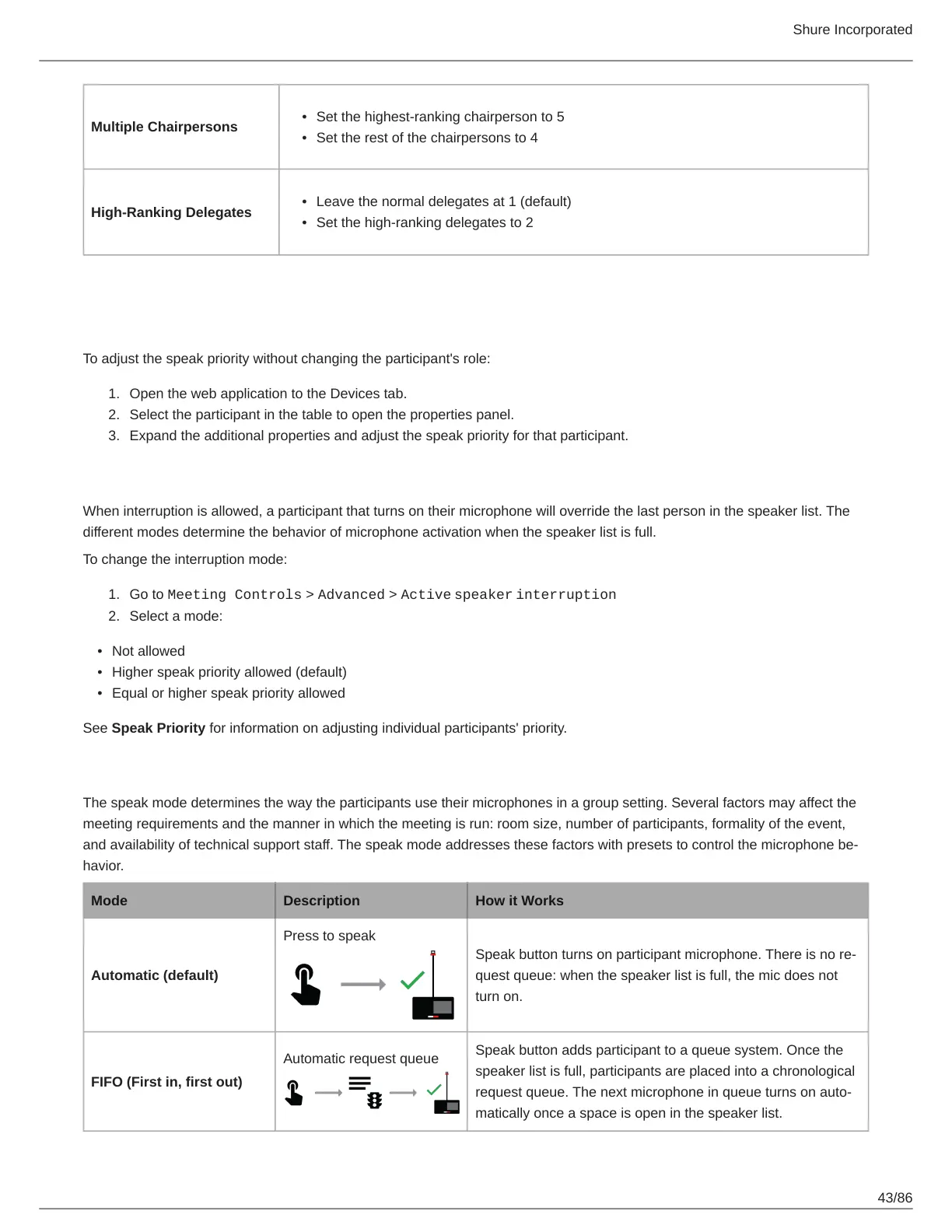 When interruption is allowed, a participant that turns on their microphone will override the last person in the speaker list. The