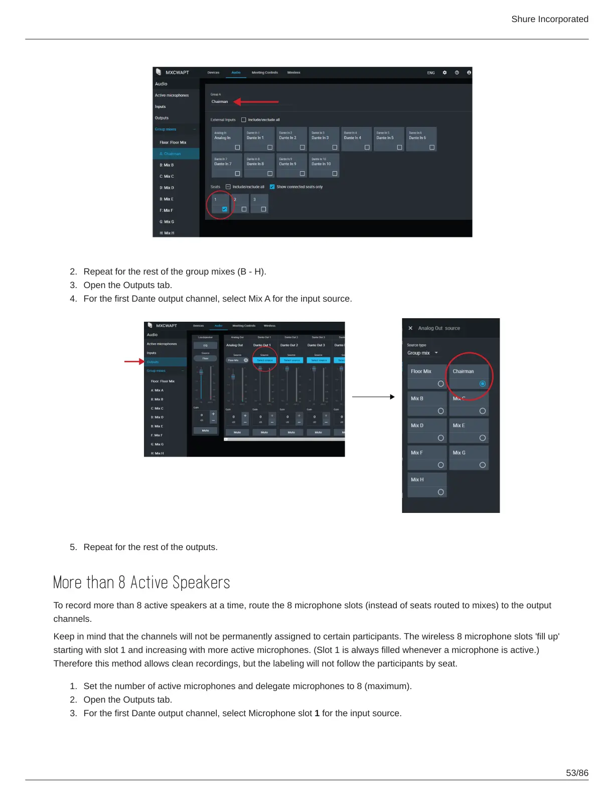 To record more than 8 active speakers at a time, route the 8 microphone slots (instead of seats routed to mixes) to the output