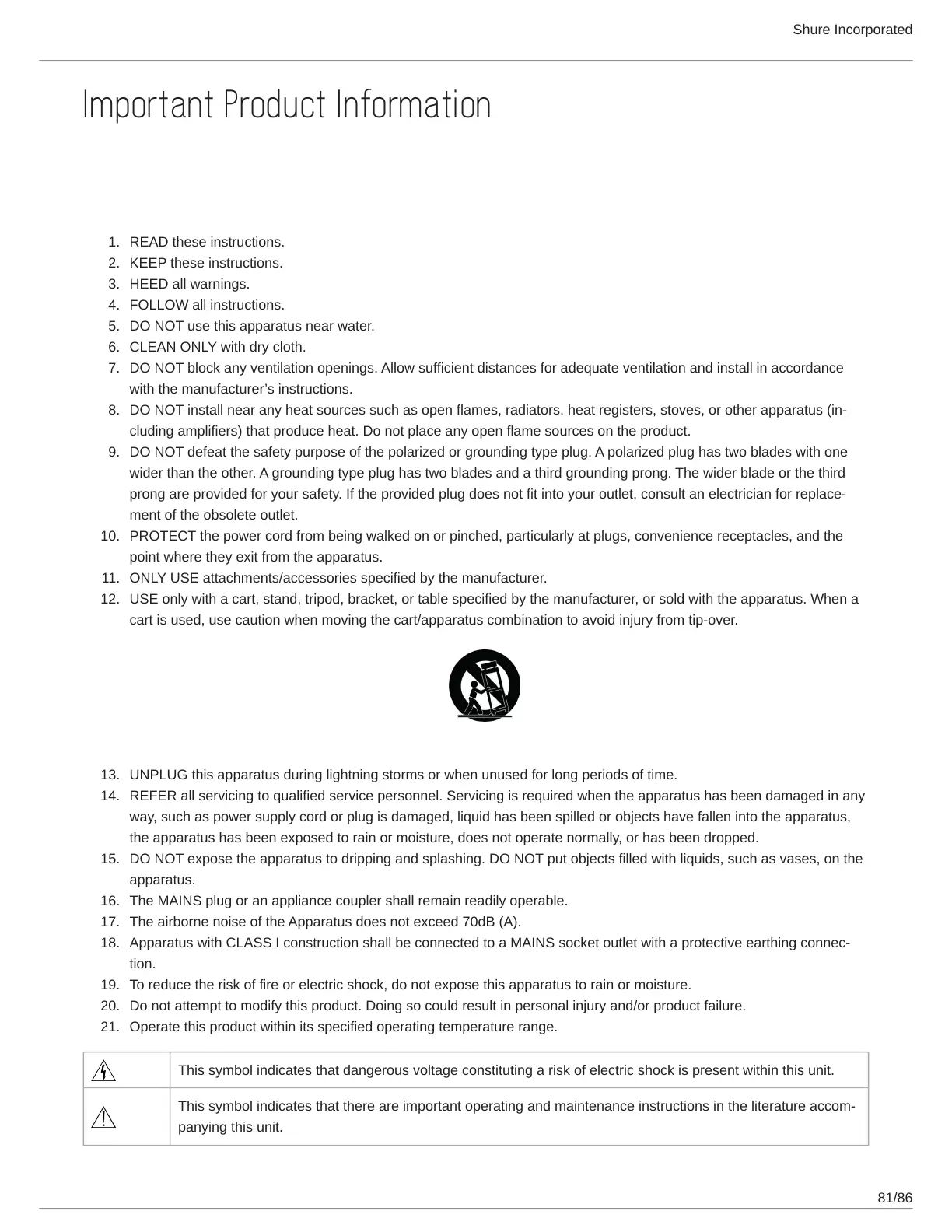 cart is used, use caution when moving the cart/apparatus combination to avoid injury from tip-over.