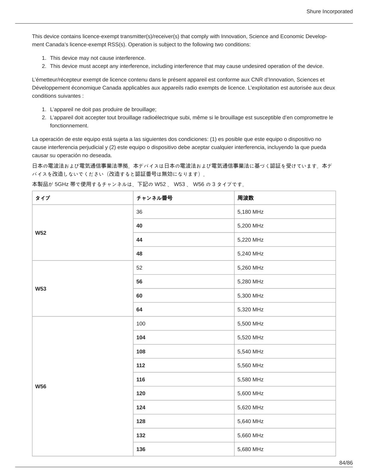 本製品が 5GHz 帯で使用するチャンネルは、下記の W52 、 W53 、 W56 の 3 タイプです。