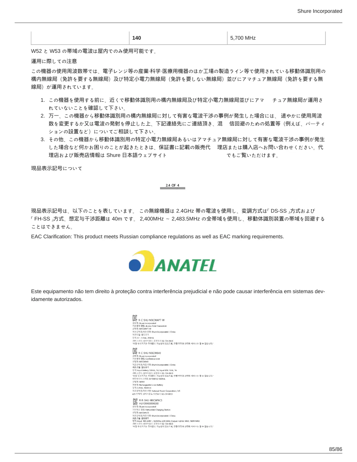 「 FH-SS 」方式、想定与干渉距離は 40m です。 2,400MHz ~ 2,483.5MHz の全帯域を使用し、移動体識別装置の帯域を回避する