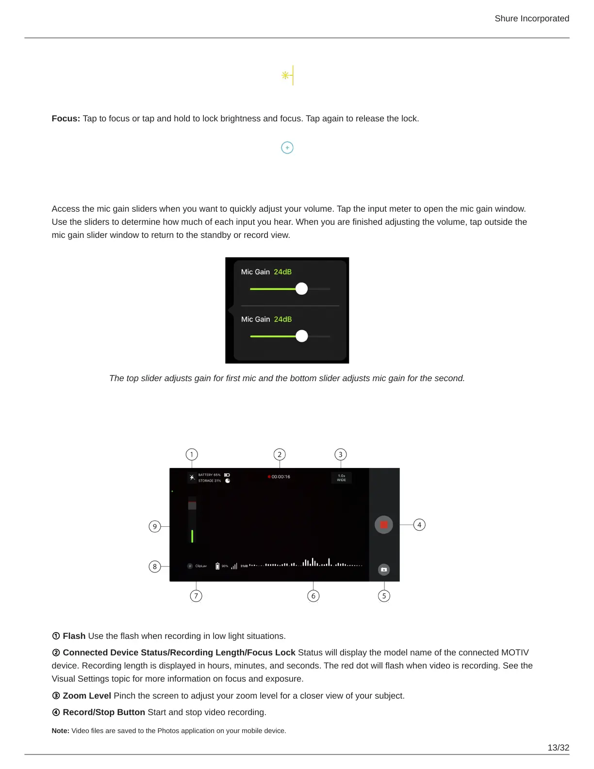 ② Connected Device Status/Recording Length/Focus Lock Status will display the model name of the connected MOTIV