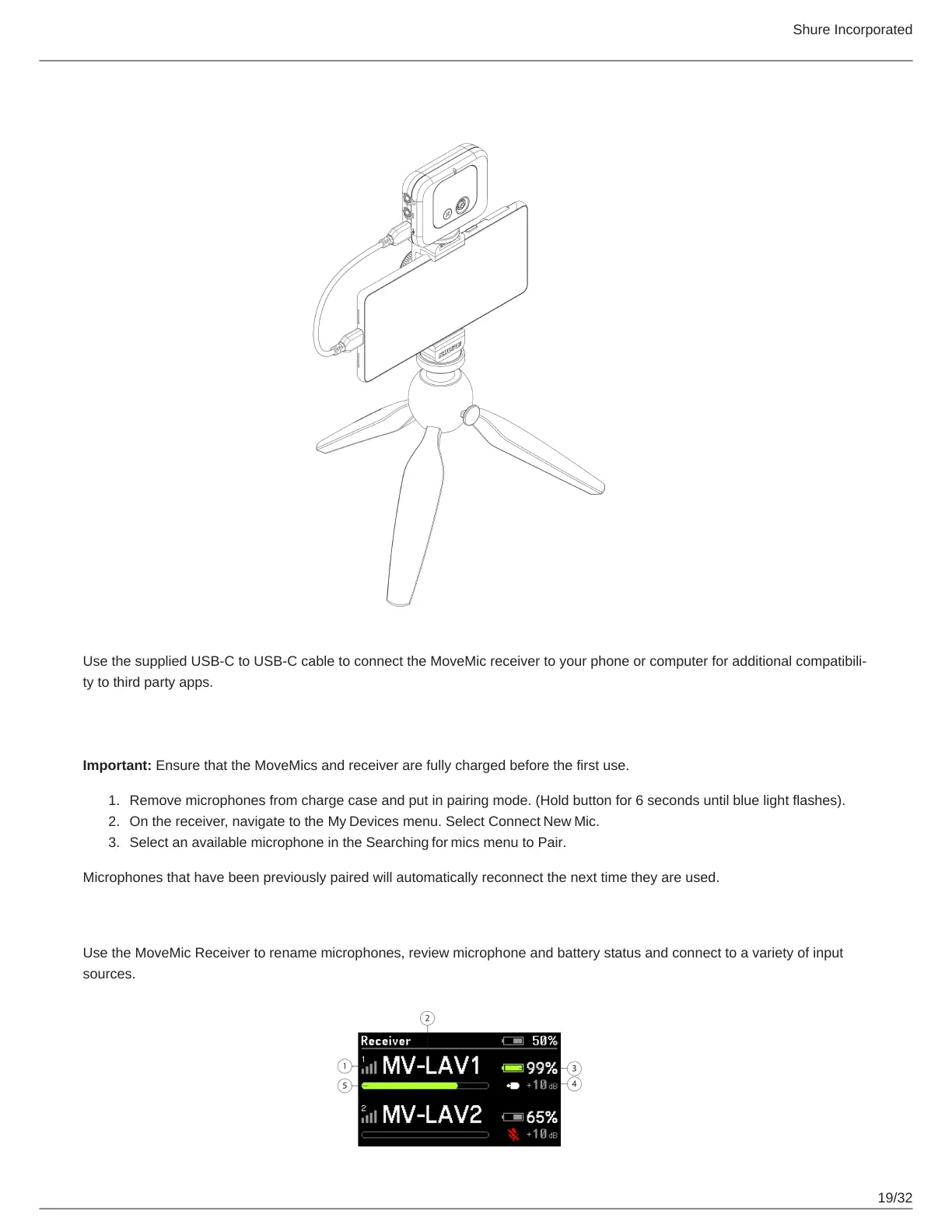 Use the supplied USBC to USBC cable to connect the MoveMic receiver to your phone or computer for additional compatibili