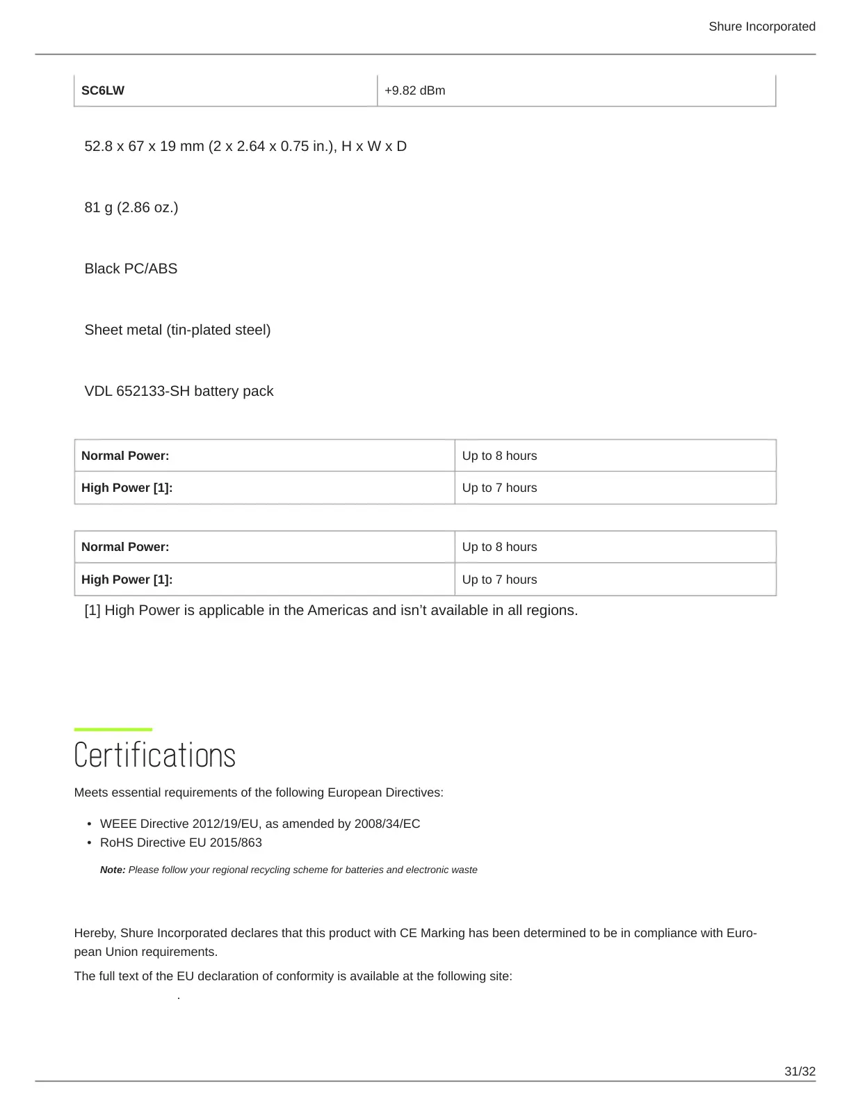 The full text of the EU declaration of conformity is available at the following site: https://www.shure.com/enEU/support/declara