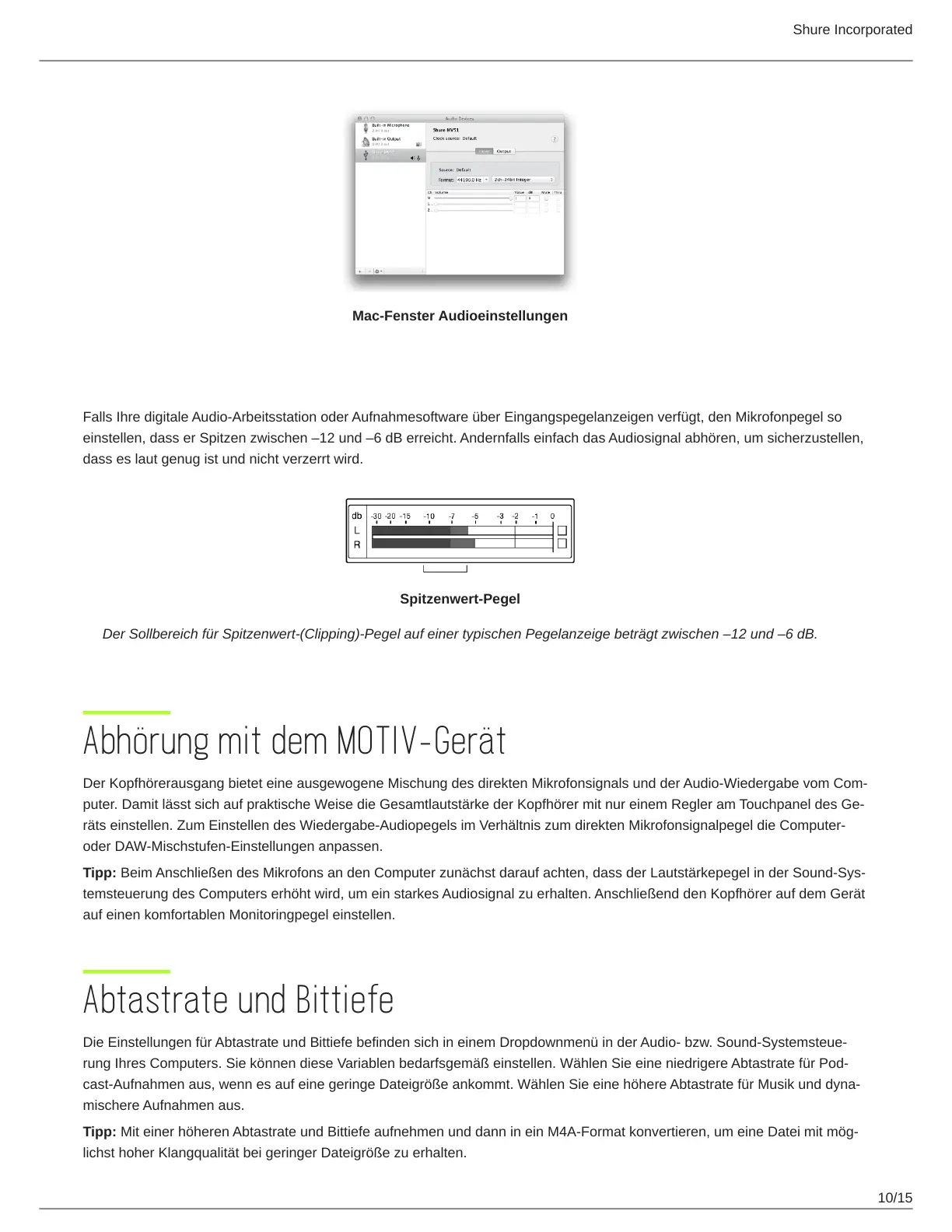 einstellen, dass er Spitzen zwischen –12 und –6 dB erreicht. Andernfalls einfach das Audiosignal abhören, um sicherzustellen,