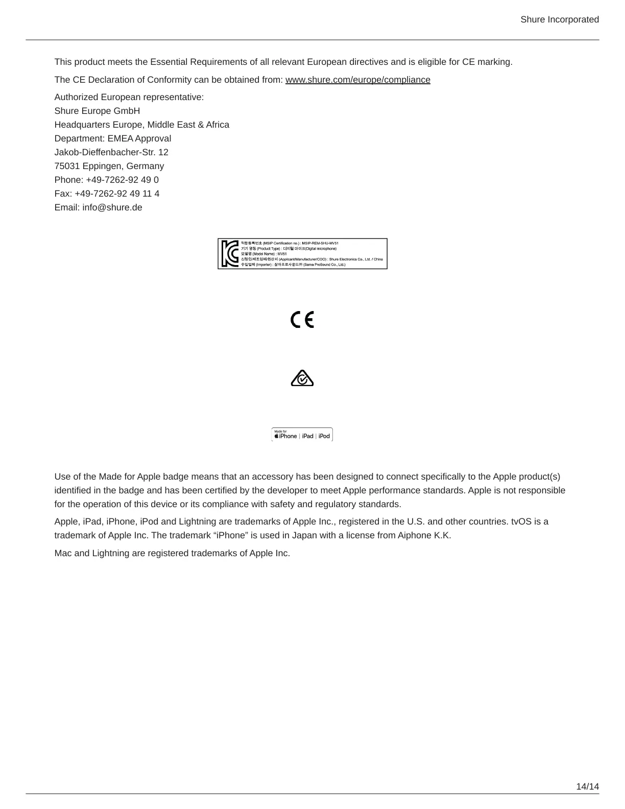 The CE Declaration of Conformity can be obtained from: www.shure.com/europe/compliance