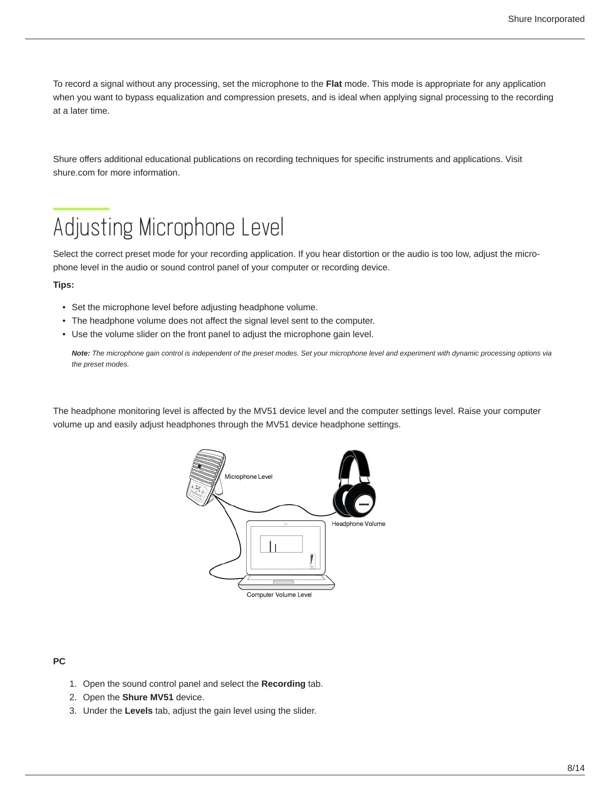 To record a signal without any processing, set the microphone to the Flat mode. This mode is appropriate for any application