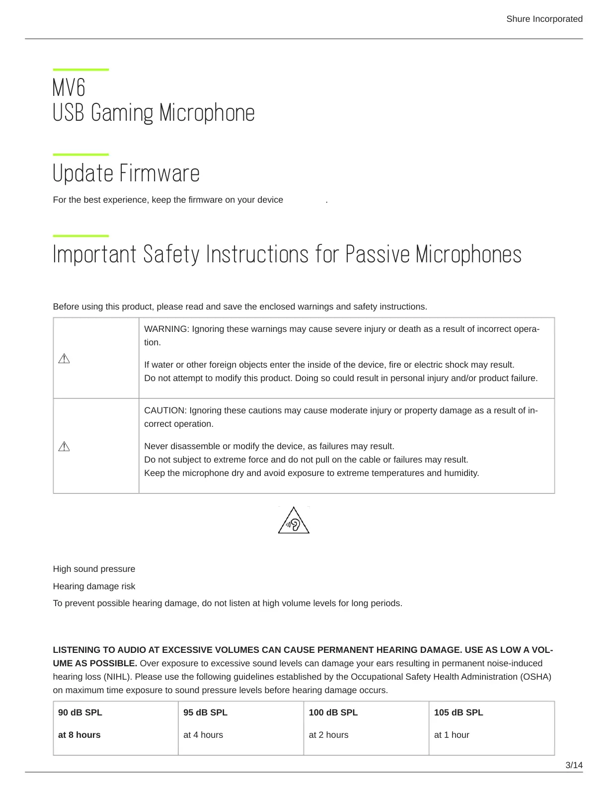 UME AS POSSIBLE. Over exposure to excessive sound levels can damage your ears resulting in permanent noise-induced