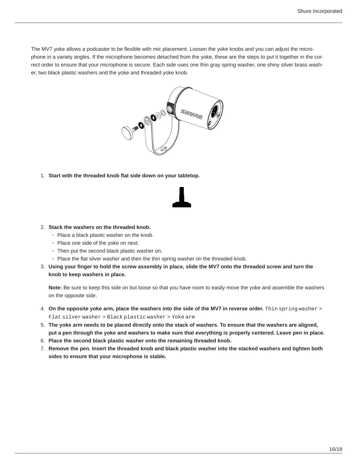 On the opposite yoke arm, place the washers into the side of the MV7 in reverse order. Thin spring washer >