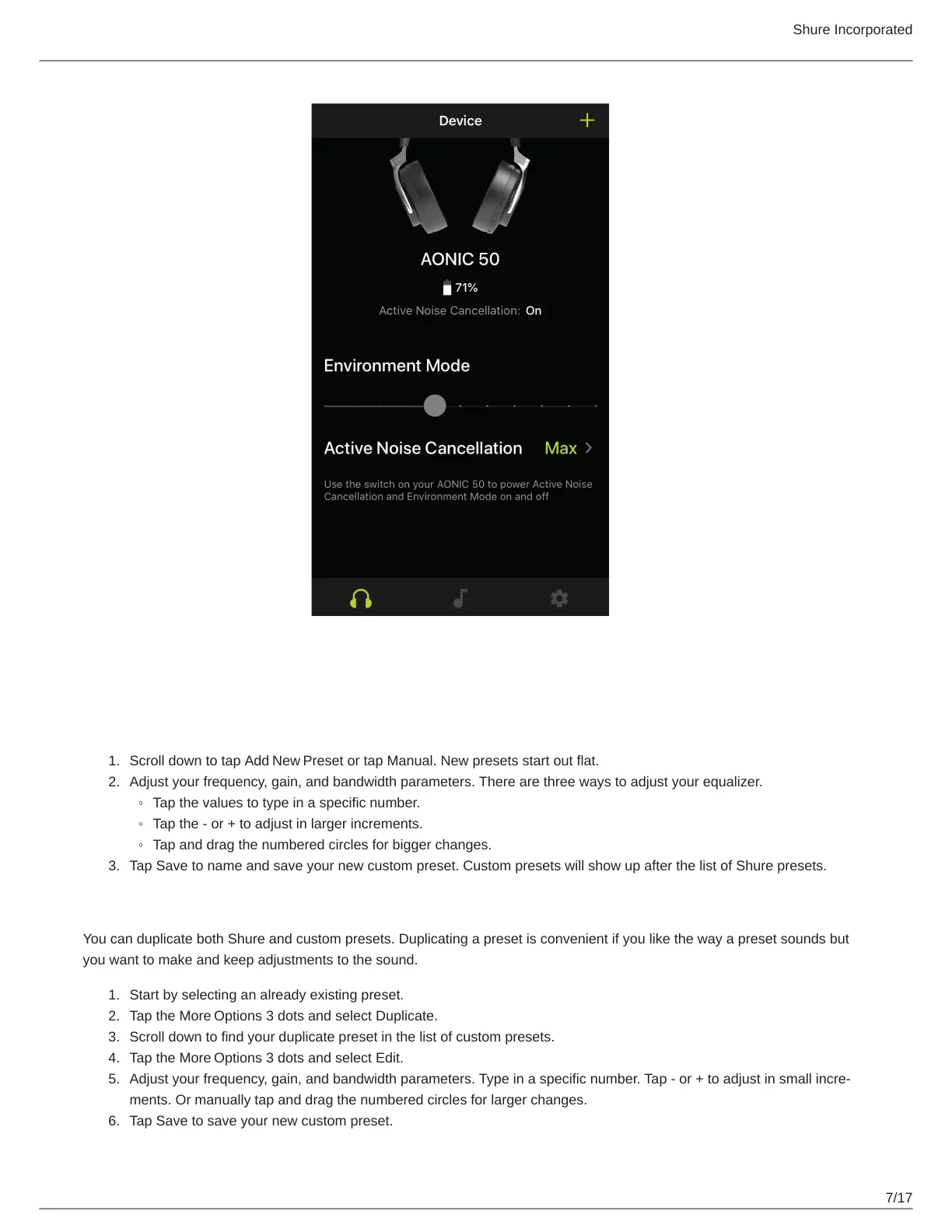 You can duplicate both Shure and custom presets. Duplicating a preset is convenient if you like the way a preset sounds but