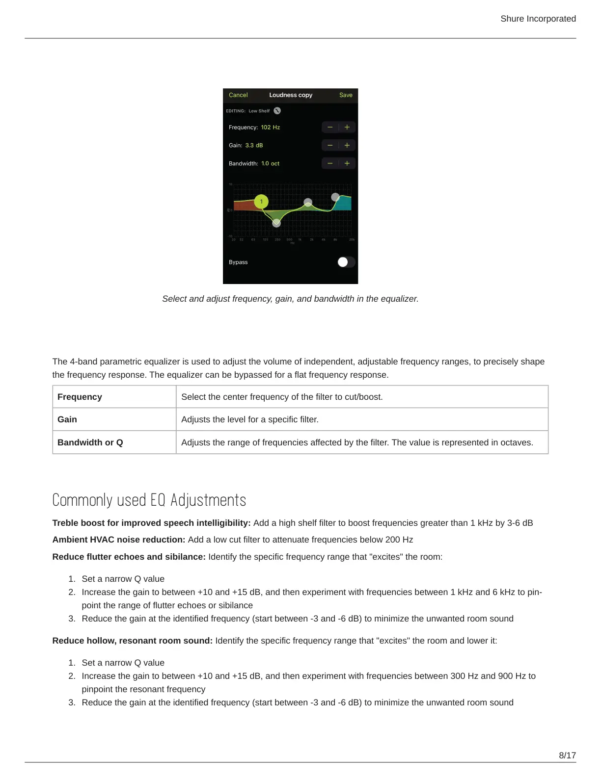Select and adjust frequency, gain, and bandwidth in the equalizer.