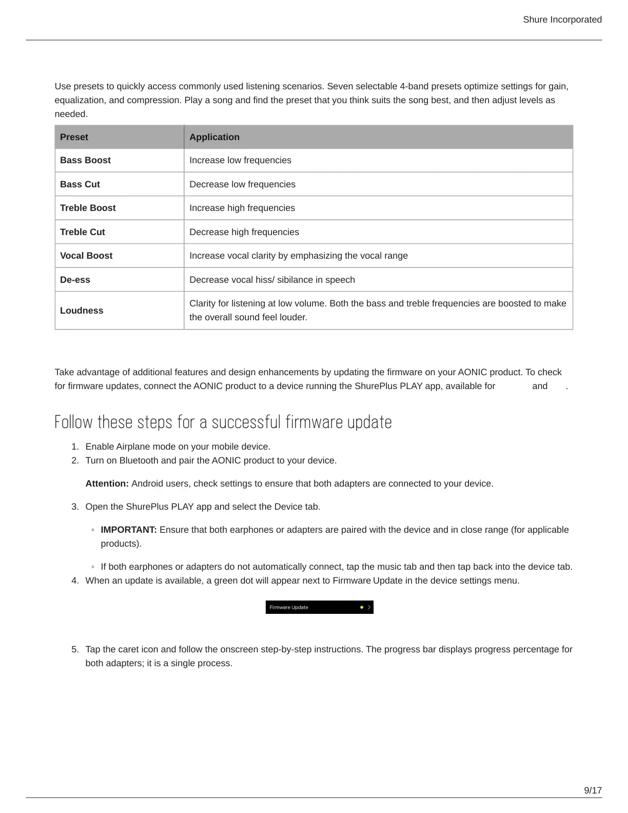 for firmware updates, connect the AONIC product to a device running the ShurePlus PLAY app, available for Android and iOS.