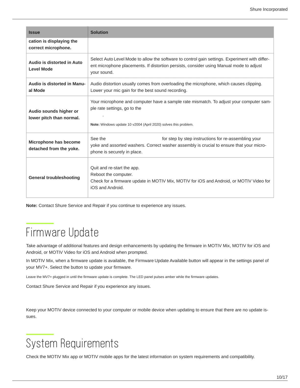 Note: Contact Shure Service and Repair if you continue to experience any issues.