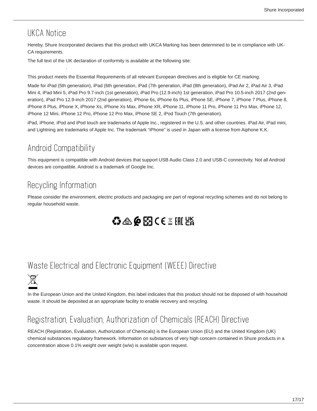 Hereby,ShureIncorporateddeclaresthatthisproductwithUKCAMarkinghasbeendeterminedtobeincompliancewithUK