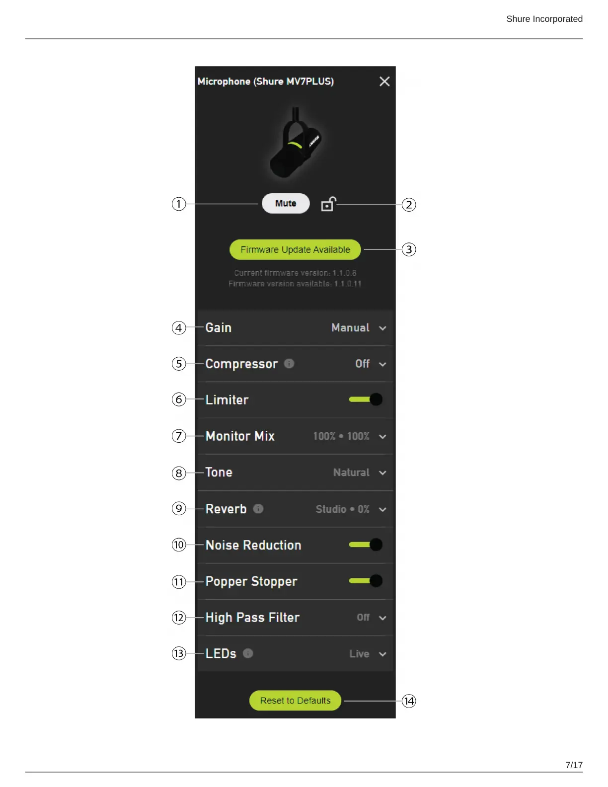 Shure MV7+ - MOTIV Mix Application Interface Details; Core Microphone Settings; Firmware Updates and Reset Options