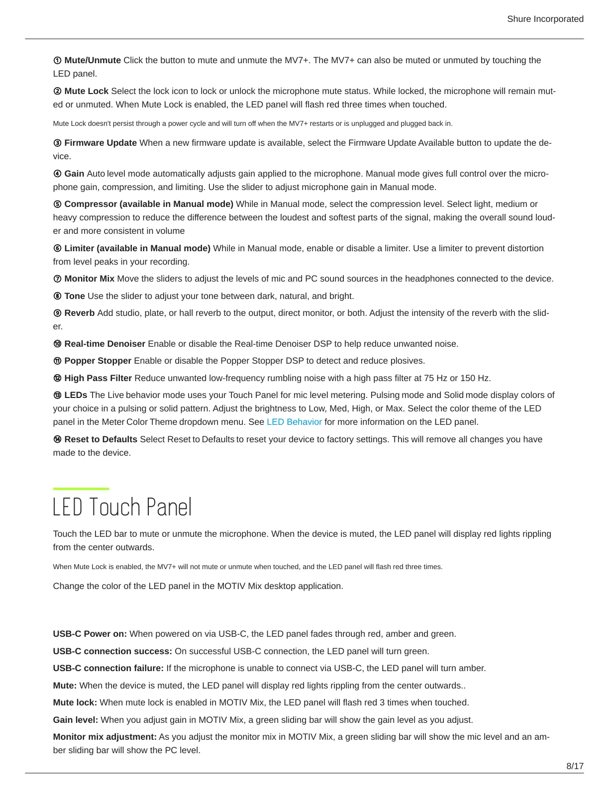 ⑬ LEDs The Live behavior mode uses your Touch Panel for mic level metering. Pulsing mode and Solid mode display colors of