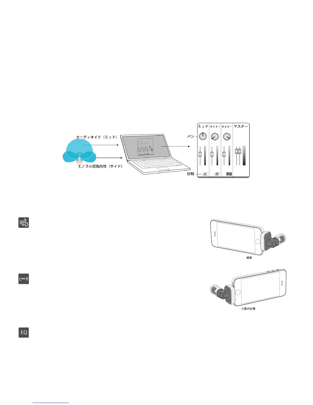ヒ ント:チャンネル入替が必要かどうかはマイクロホンの円筒部にある L と R の インジ ケーター で 確 認しま