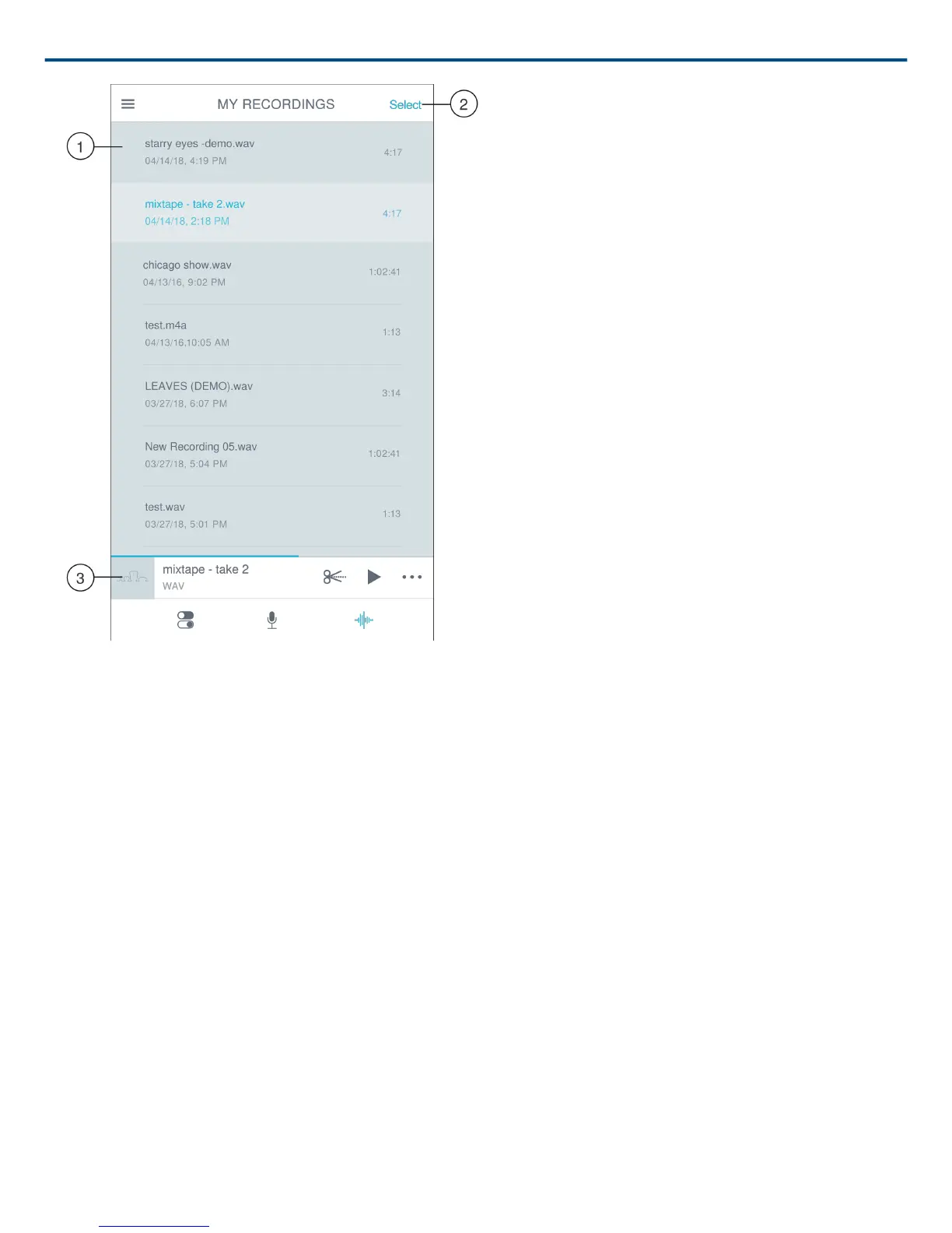 Tap the Edit icon to access the Editor. Play and pause recordings. Tap the three dots to access renaming, sharing,