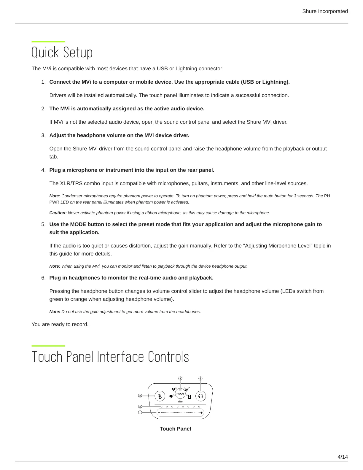Note: When using the MVi, you can monitor and listen to playback through the device headphone output.