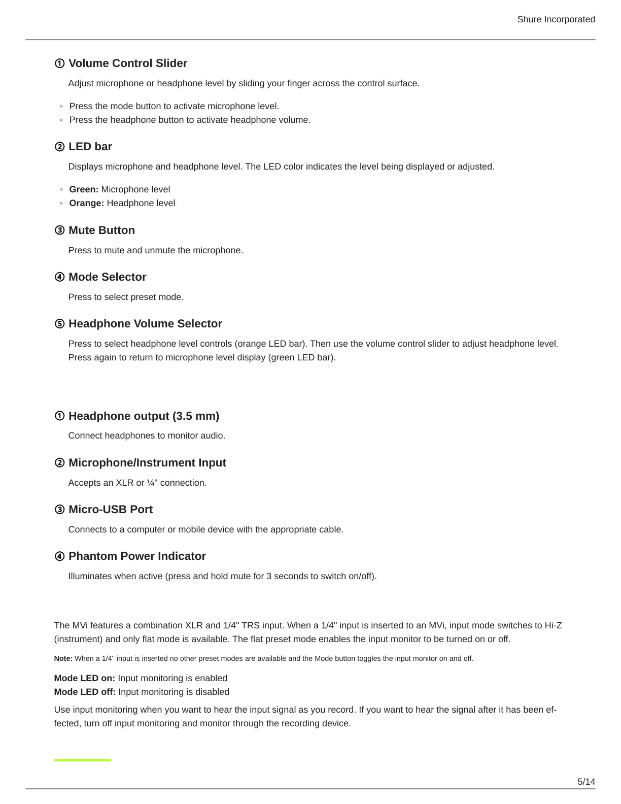 The MVi features a combination XLR and 1/4" TRS input. When a 1/4" input is inserted to an MVi, input mode switches to Hi-Z