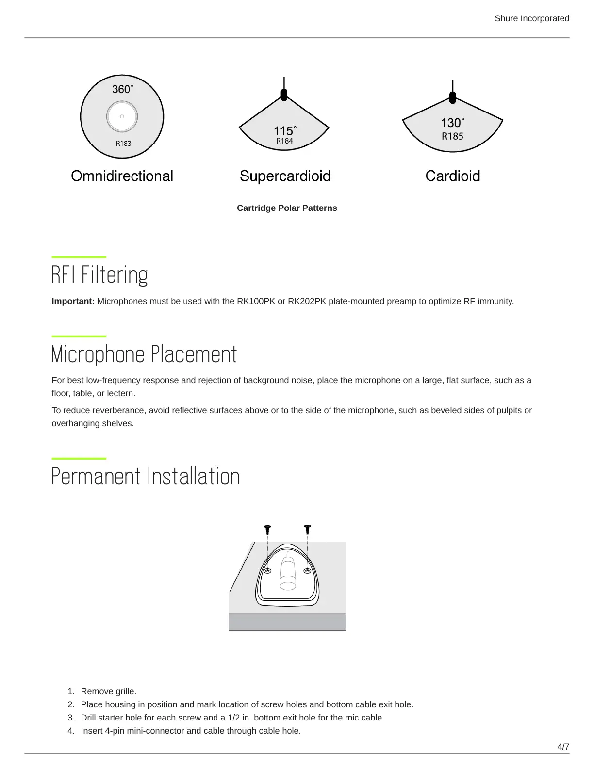 Important: Microphones must be used with the RK100PK or RK202PK plate-mounted preamp to optimize RF immunity.