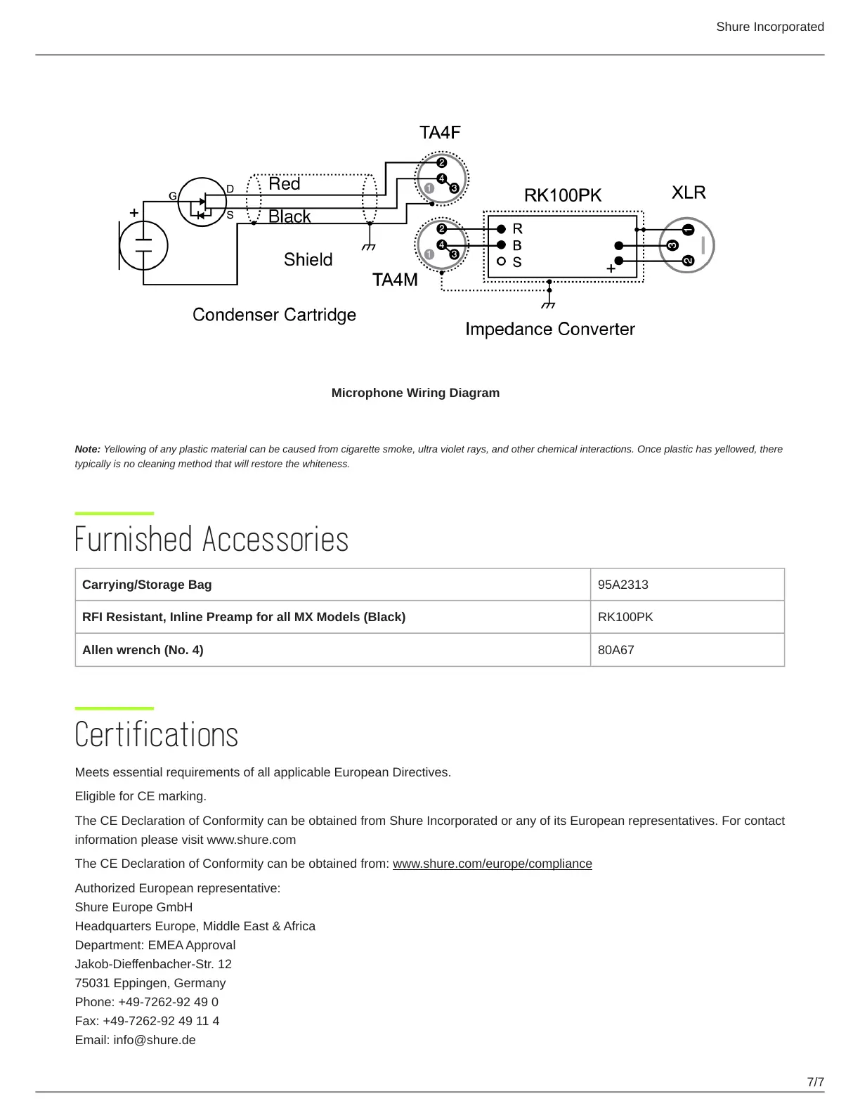 The CE Declaration of Conformity can be obtained from Shure Incorporated or any of its European representatives. For contact