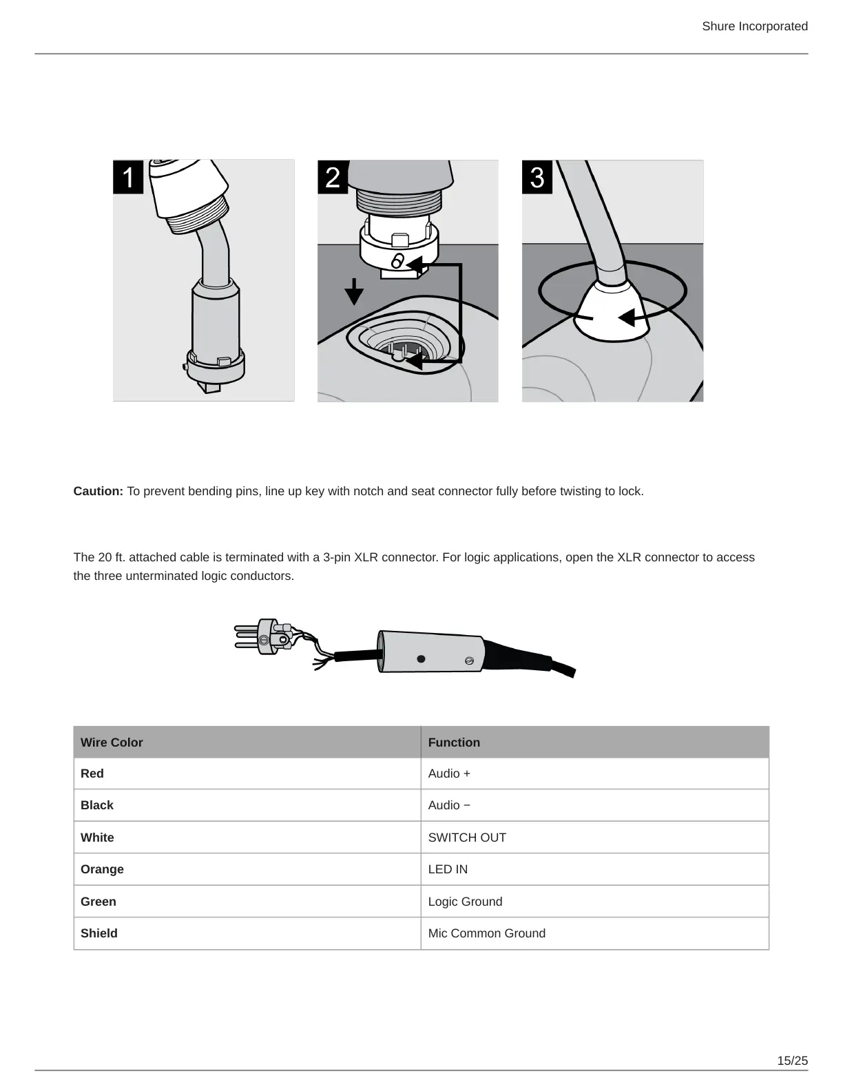 The 20 ft. attached cable is terminated with a 3-pin XLR connector. For logic applications, open the XLR connector to access