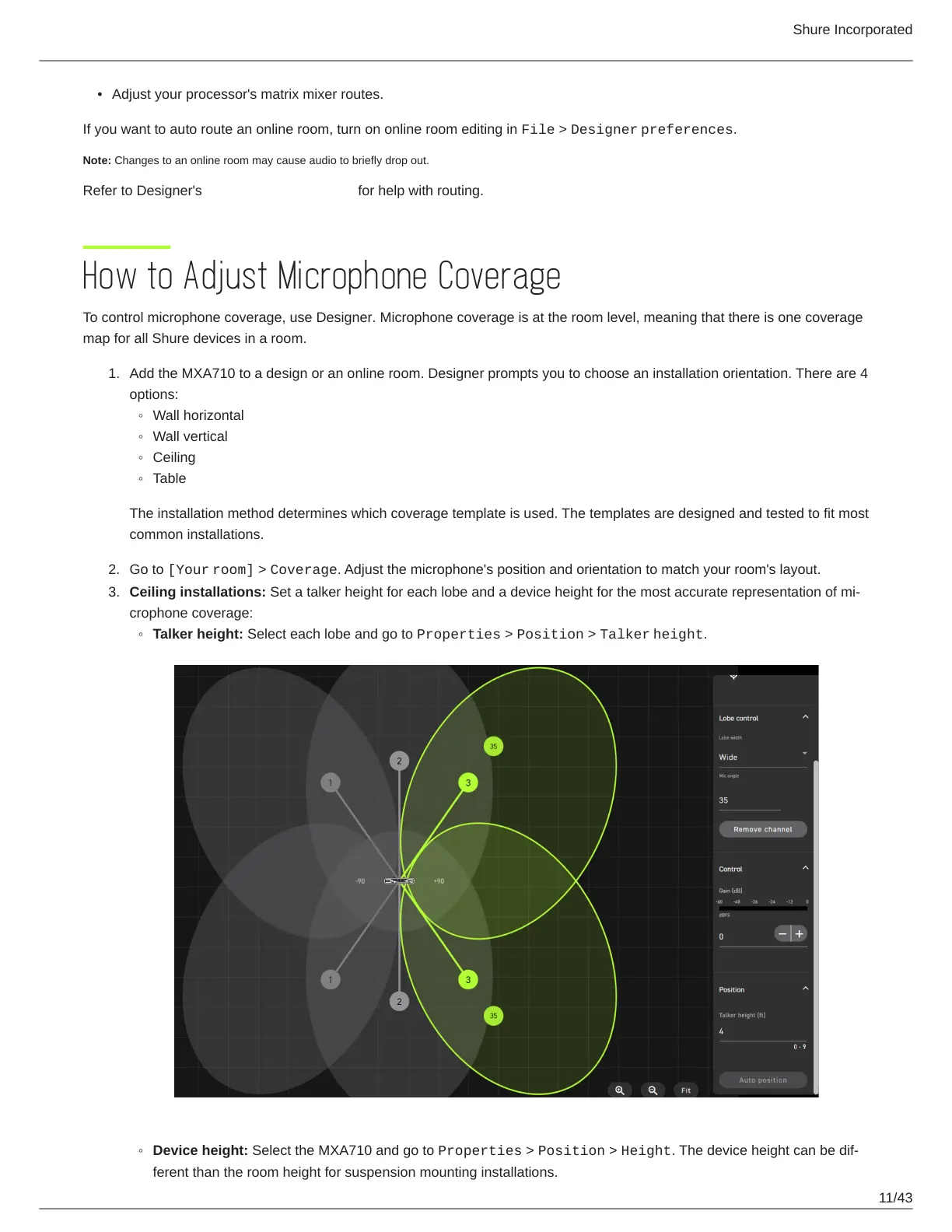 To control microphone coverage, use Designer. Microphone coverage is at the room level, meaning that there is one coverage