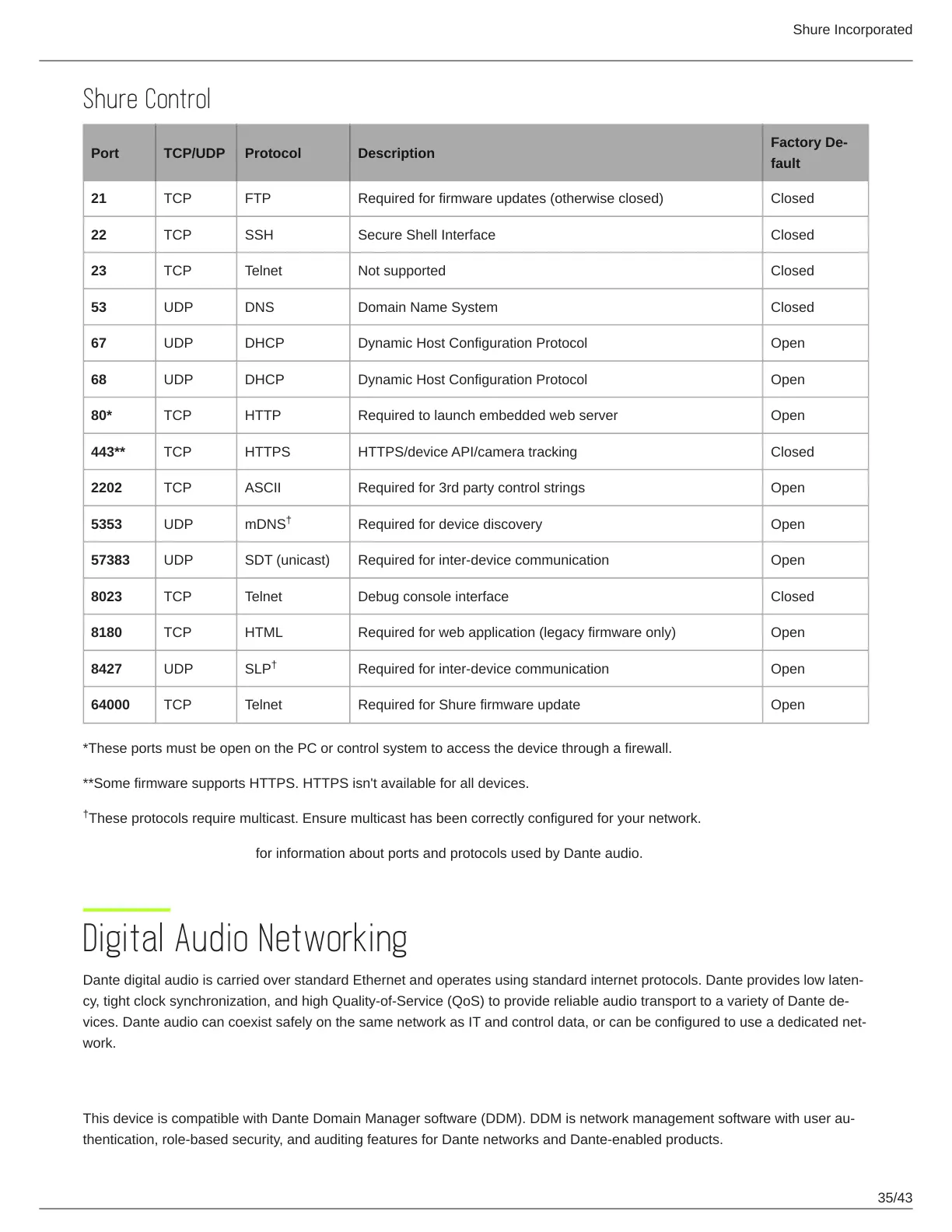 64000 TCP Telnet Required for Shure firmware update Open