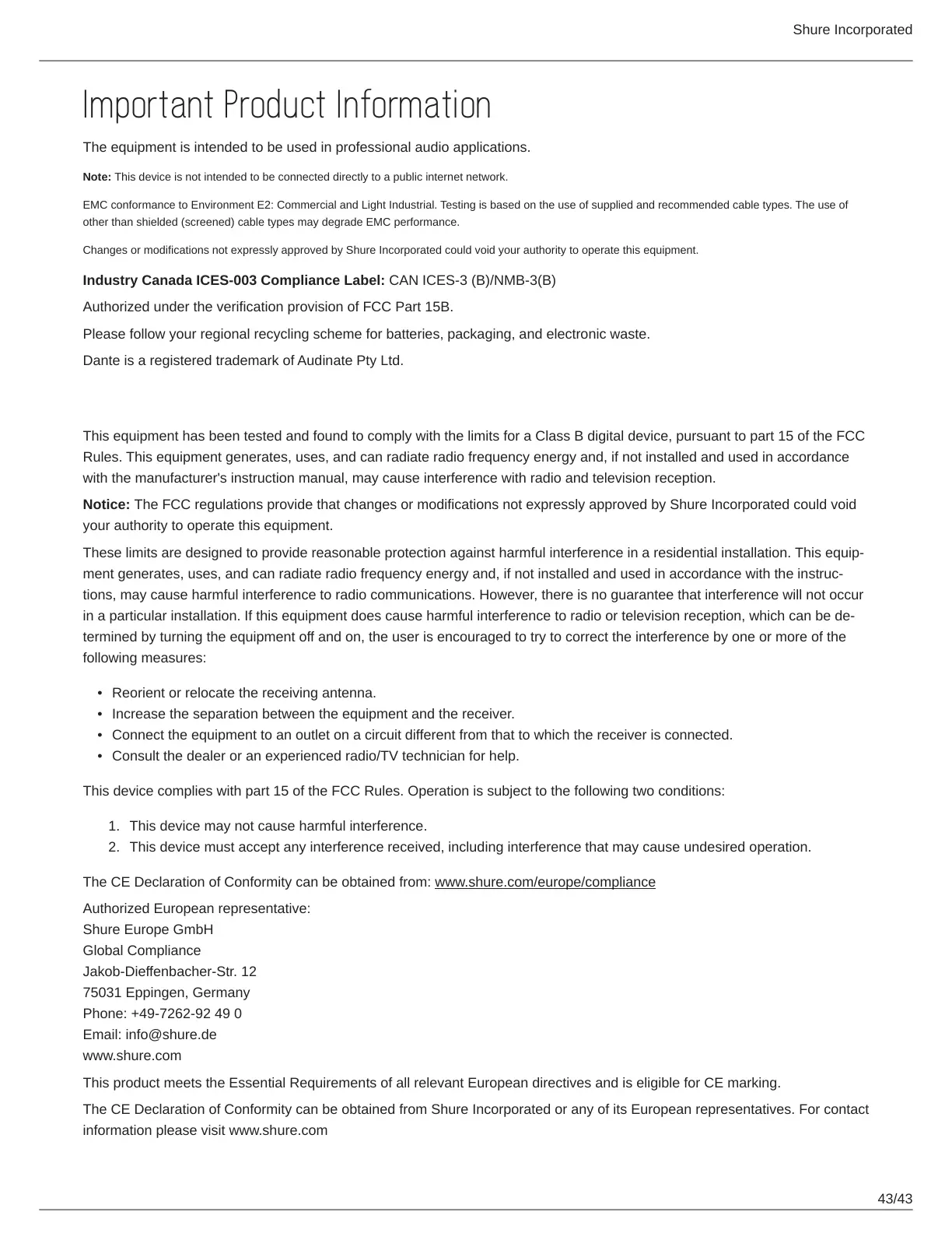 The CE Declaration of Conformity can be obtained from Shure Incorporated or any of its European representatives. For contact