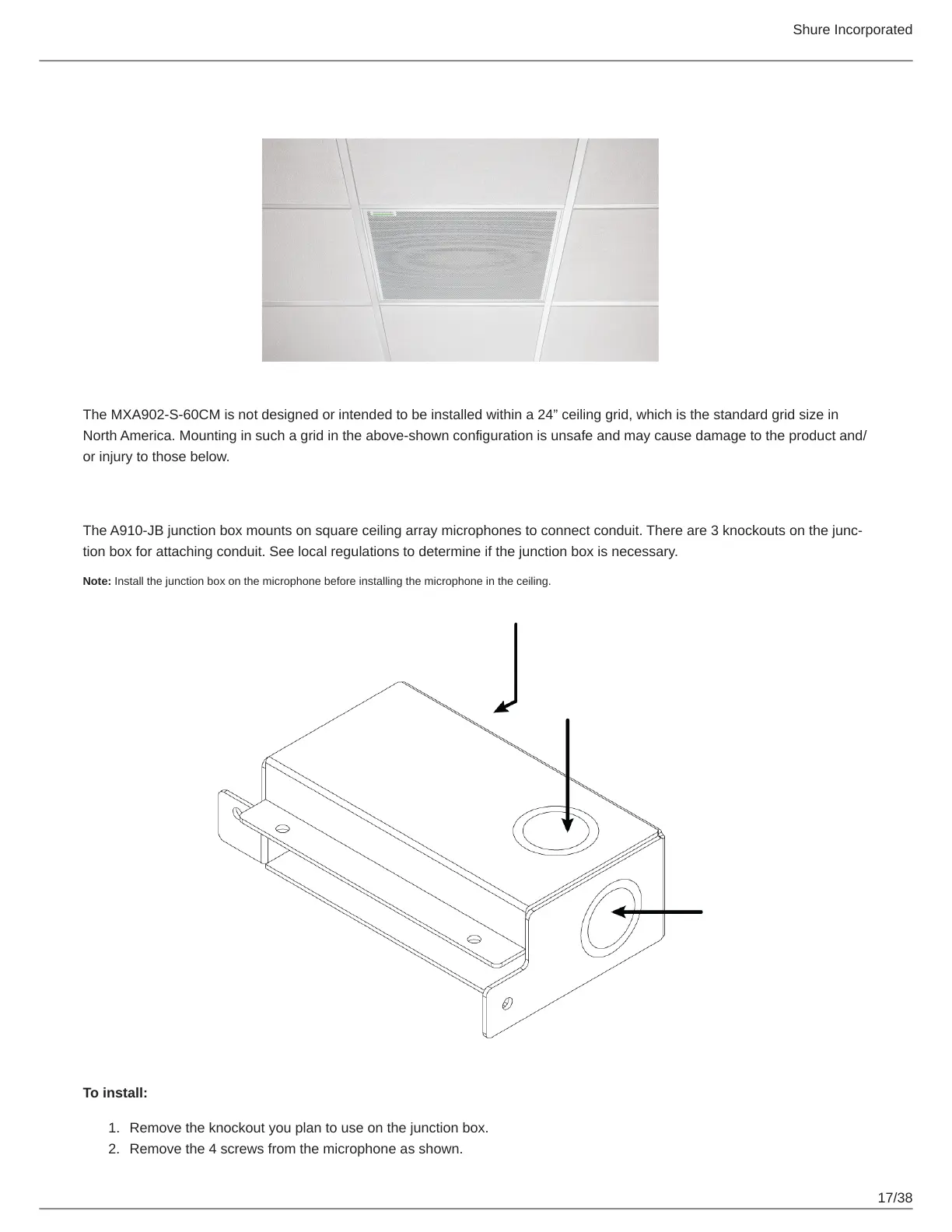 Note: Install the junction box on the microphone before installing the microphone in the ceiling.