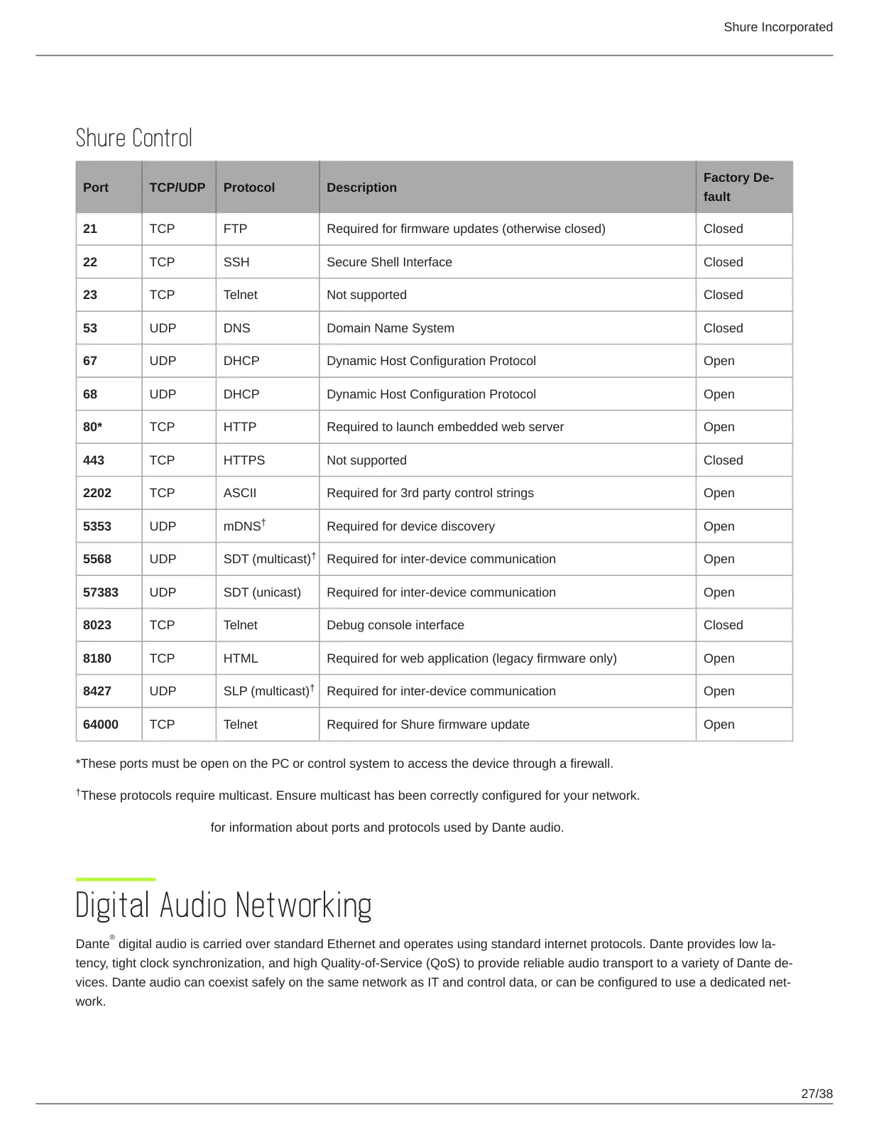 See Audinate's website for information about ports and protocols used by Dante audio.
