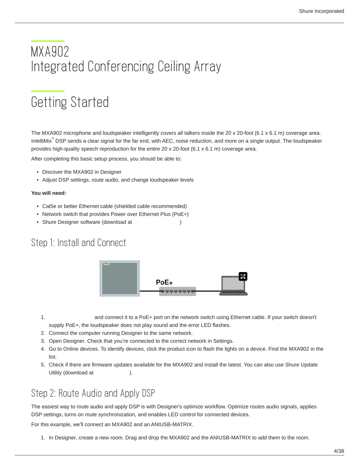Install the MXA902 and connect it to a PoE+ port on the network switch using Ethernet cable. If your switch doesn't