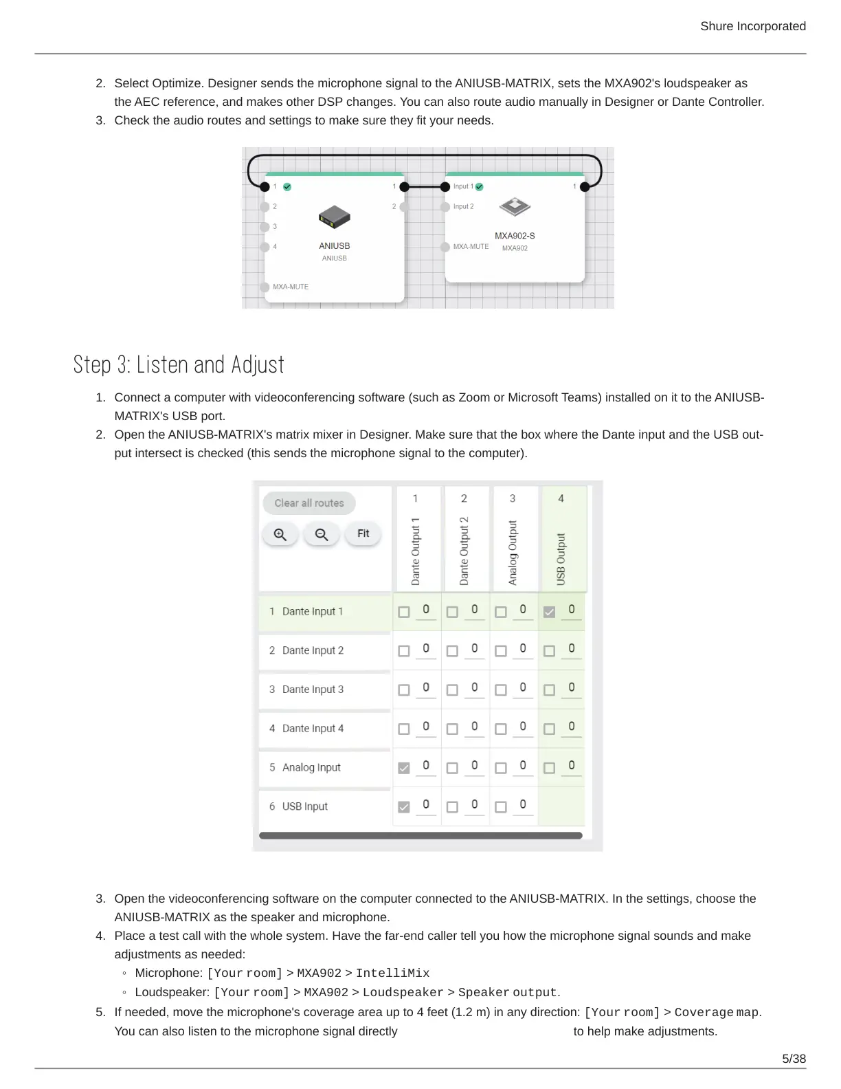 Select Optimize. Designer sends the microphone signal to the ANIUSB-MATRIX, sets the MXA902's loudspeaker as