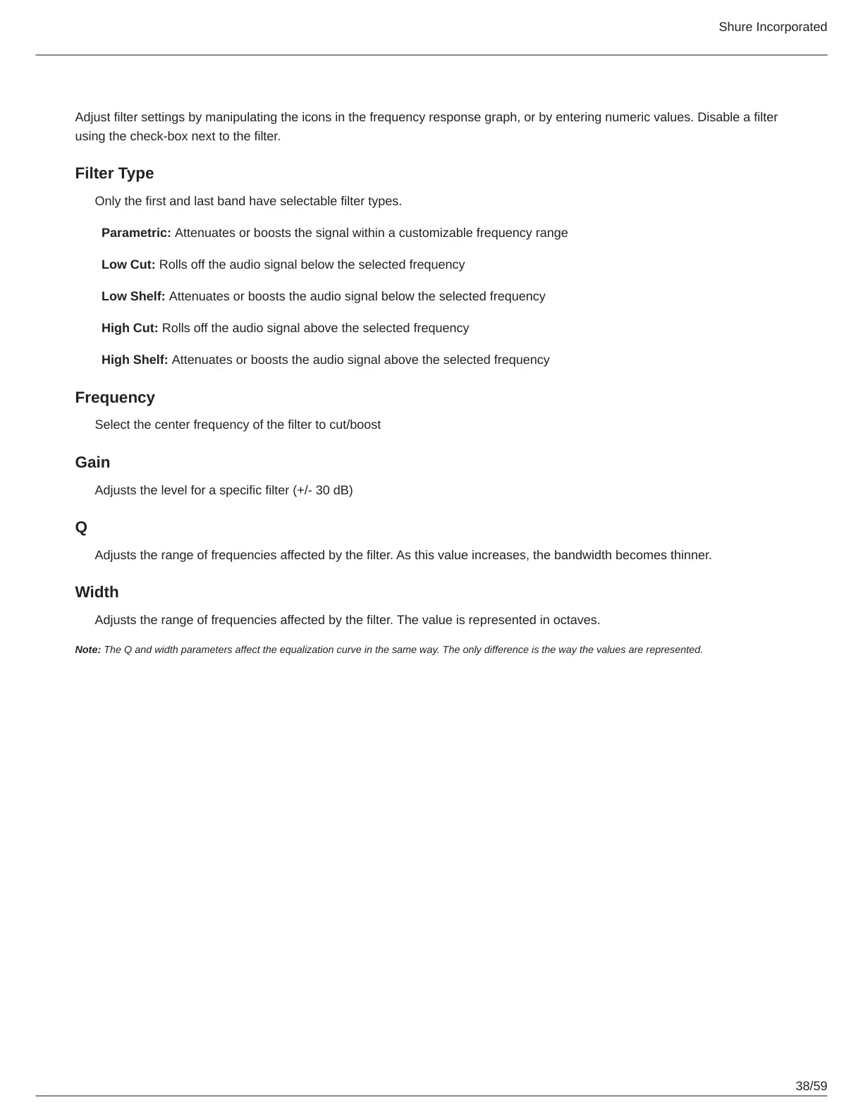 Note: The Q and width parameters affect the equalization curve in the same way. The only difference is the way the values are represented.