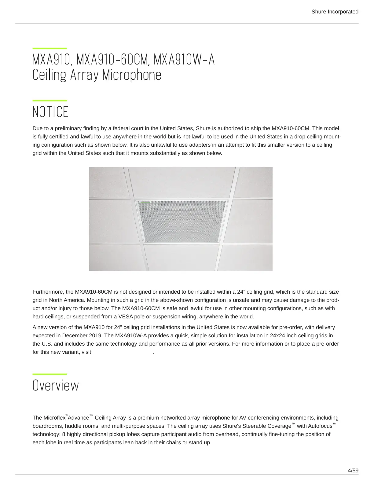 Due to a preliminary finding by a federal court in the United States, Shure is authorized to ship the MXA910-60CM. This model
