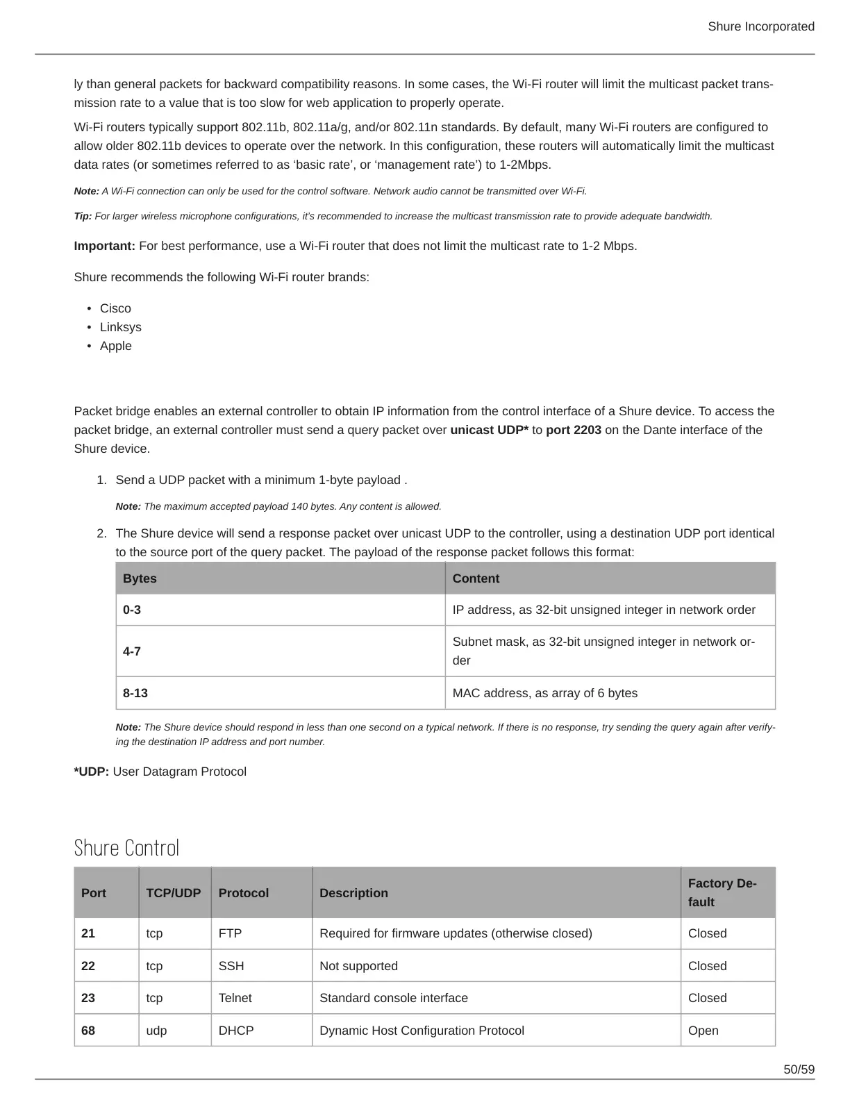 The Shure device will send a response packet over unicast UDP to the controller, using a destination UDP port identical
