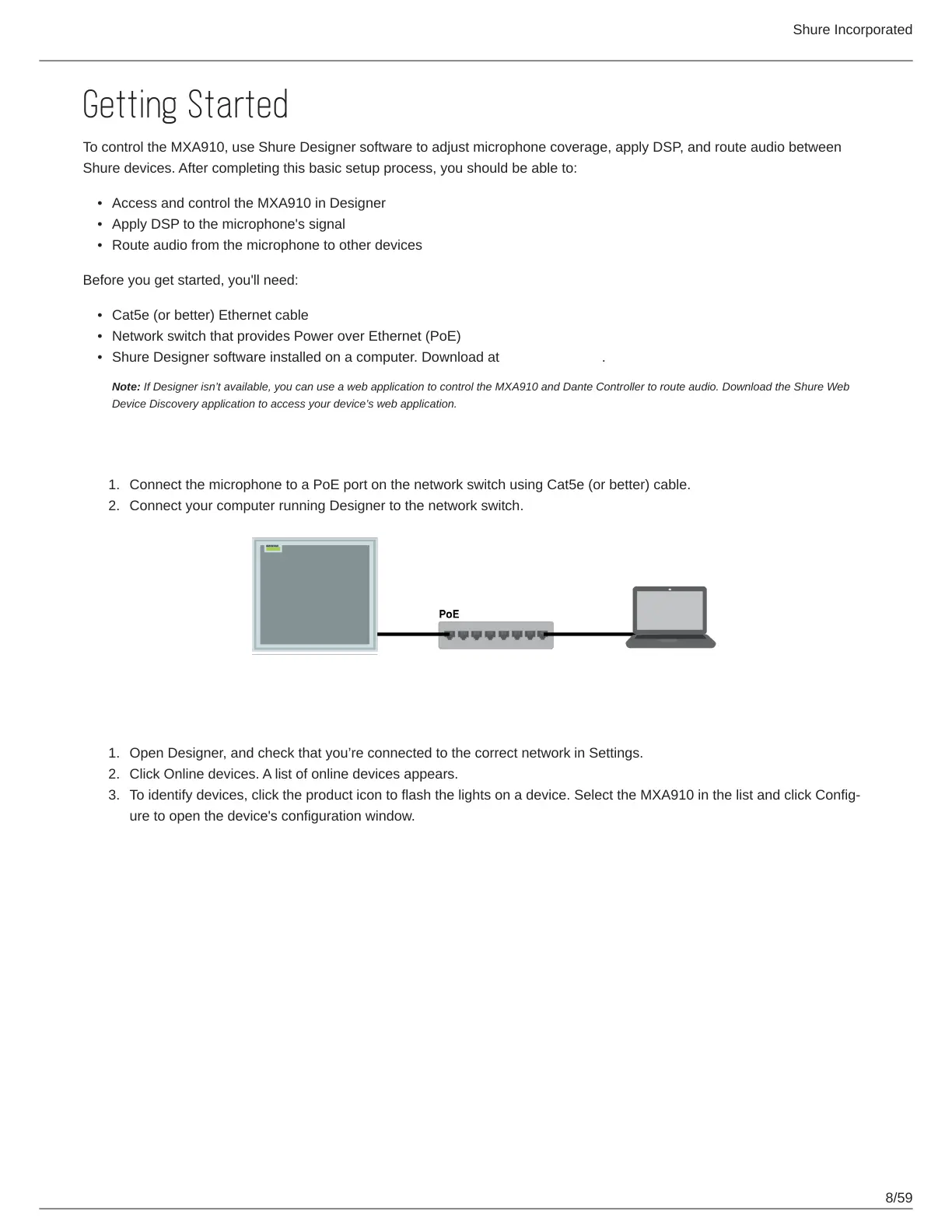 Note: If Designer isn’t available, you can use a web application to control the MXA910 and Dante Controller to route audio. Download the Shure Web