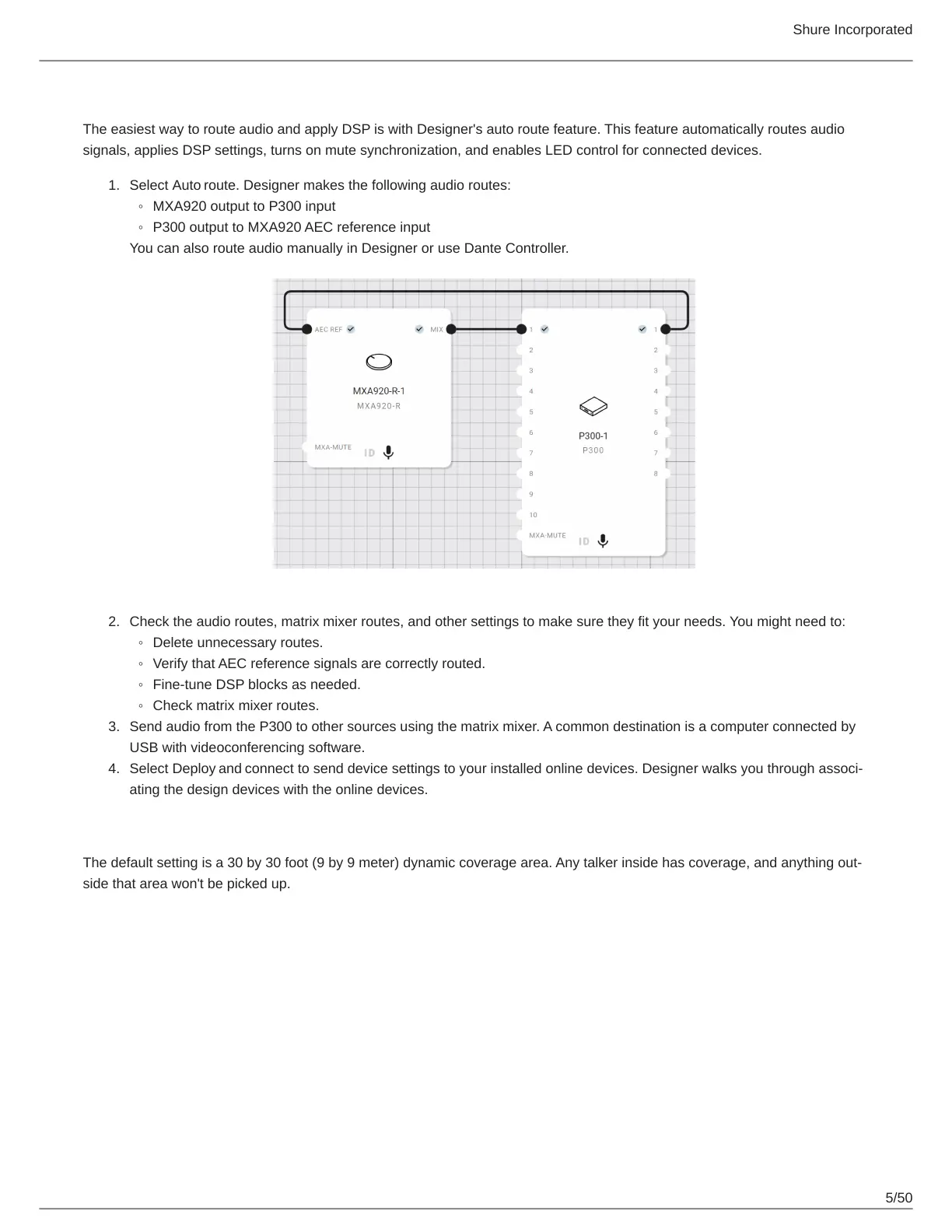The easiest way to route audio and apply DSP is with Designer's auto route feature. This feature automatically routes audio